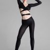 Matte leather effect and sheer tulle suspender top. A piece with graphic cut-outs harnessed with adjustable straps on the sides. Four adjustable and removable suspenders. The collection’s signature golden “feti-chic” ring embellishes the front, inviting you to attach it.