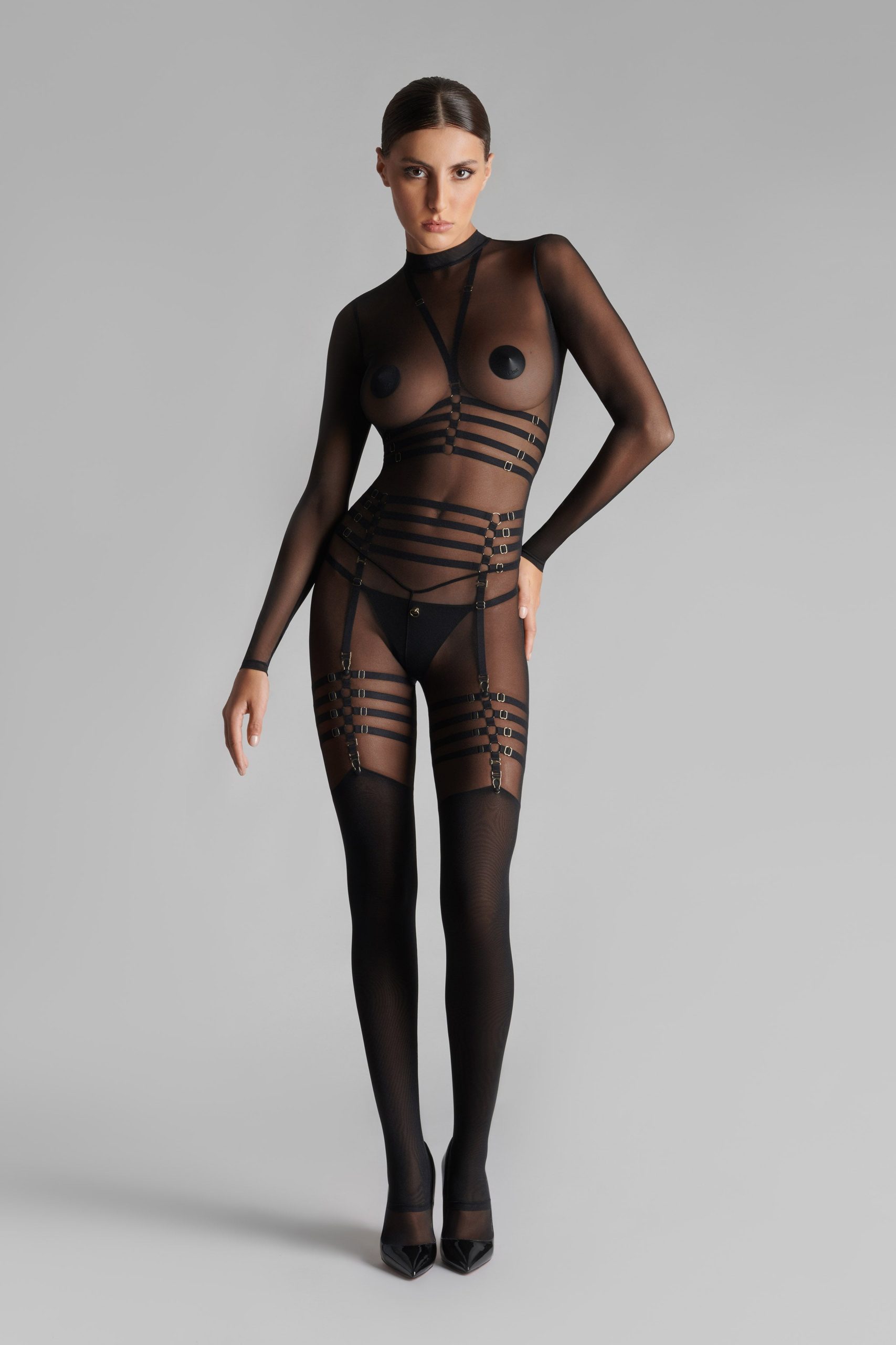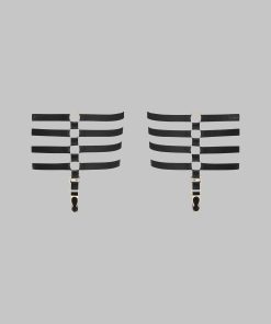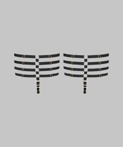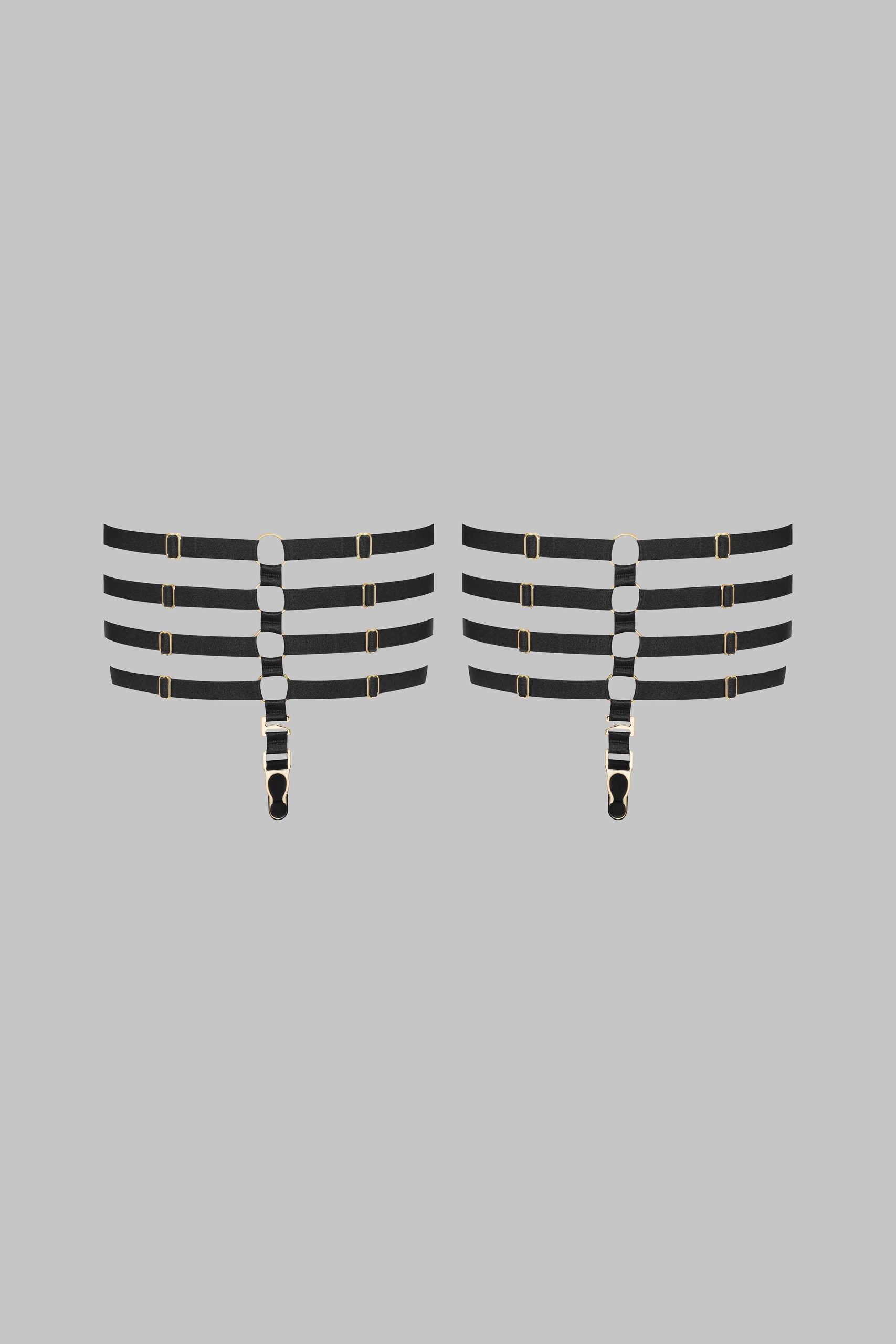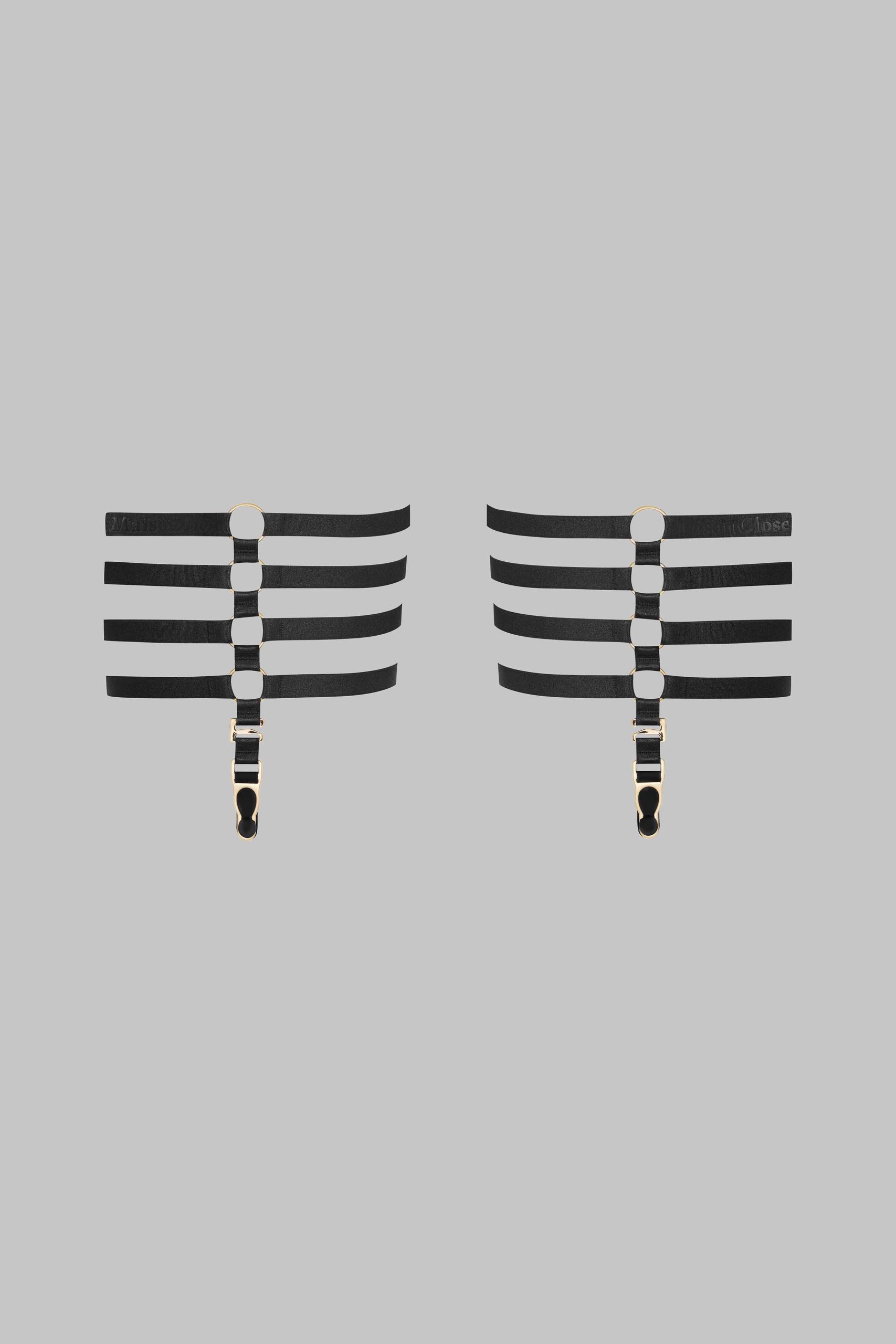 Chambre Noire suspenders by Maison Close. A jewellery-accented accessory to subtly accentuate your nudity with clusters of fine gold rings and elastic ribbons. Adjustable for all body shapes.