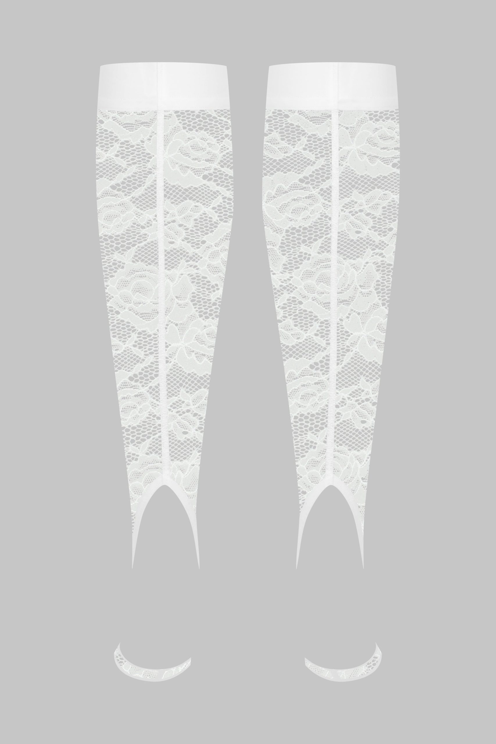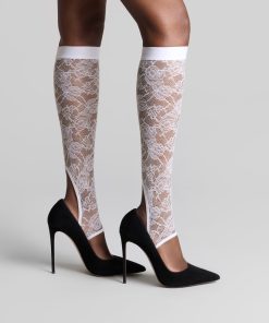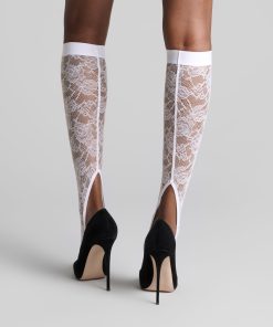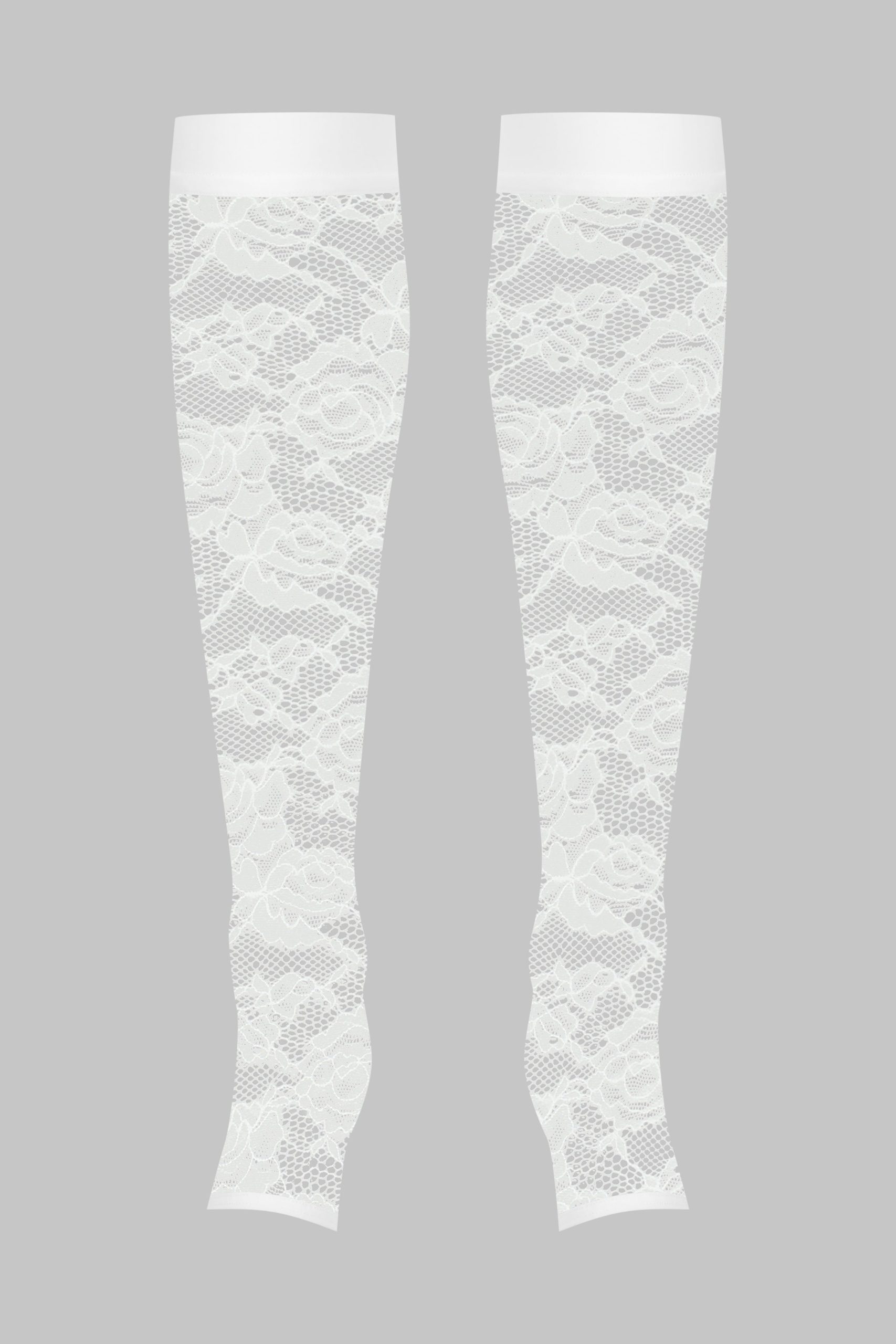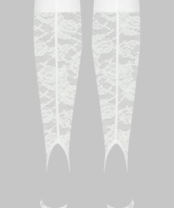 These legwarmers are made from mostly recycled openwork lace. Fitted style with flat elasticated trim. Scalloped opening at the back of the leg. Open toes.