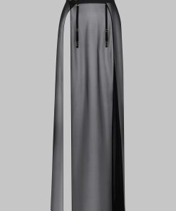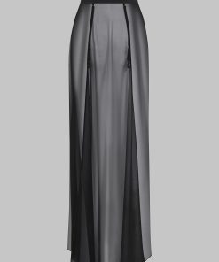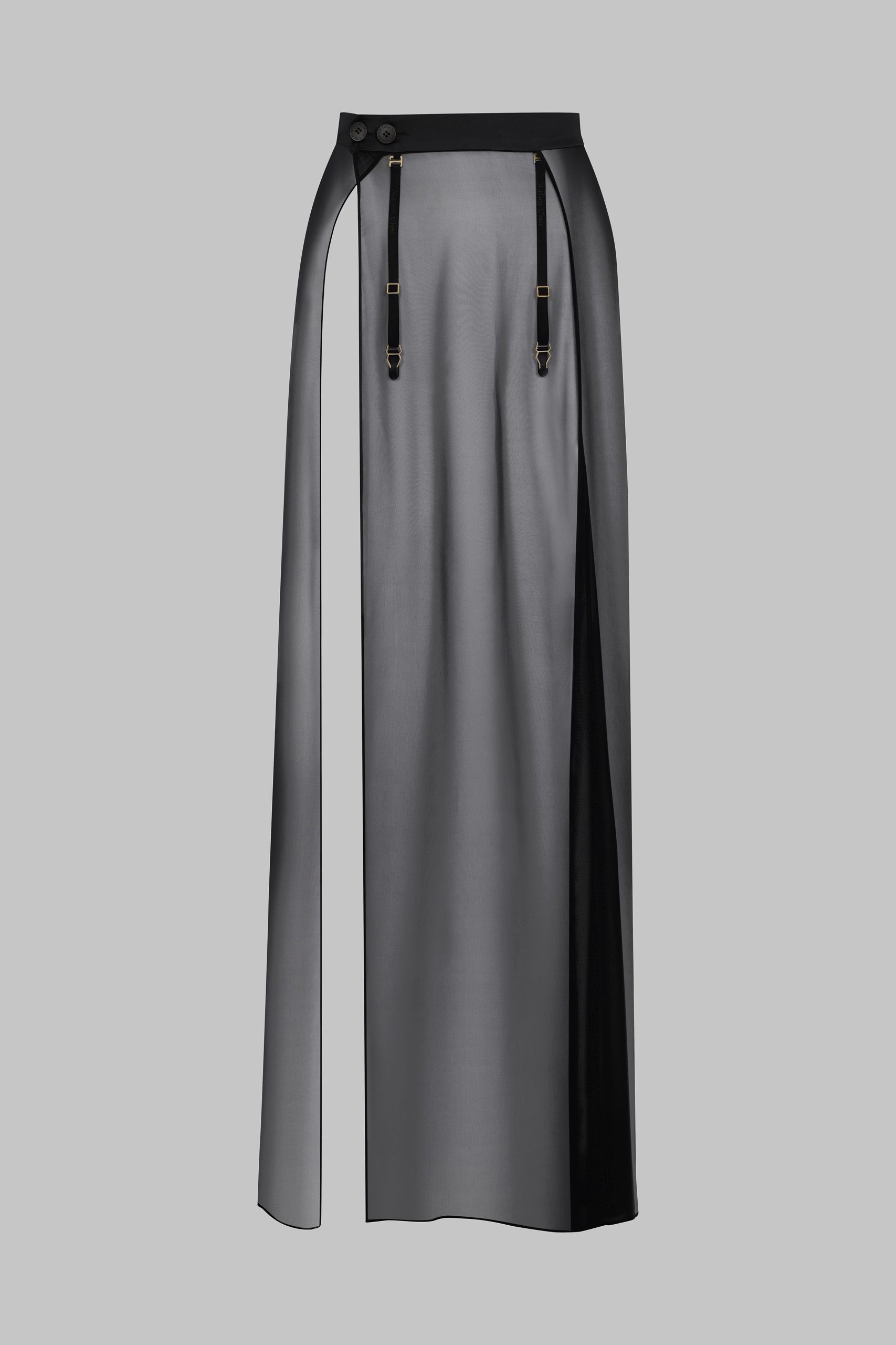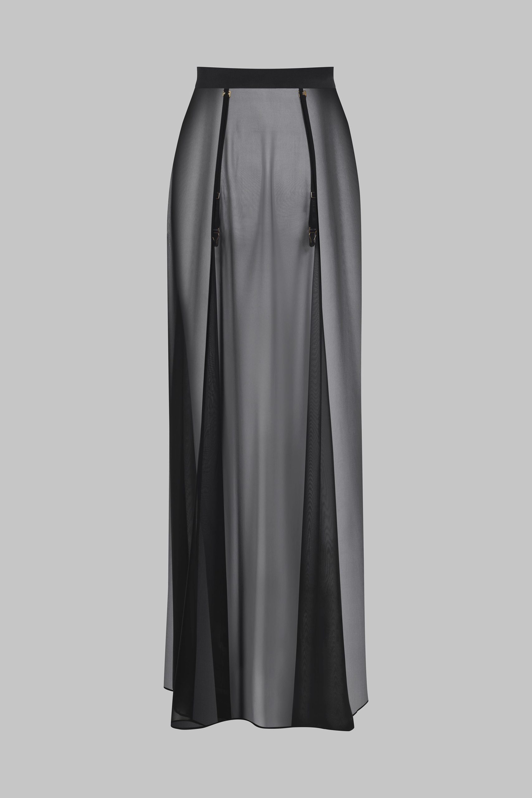 This high-waisted maxi skirt is light and totally sheer. It is crafted from ultra-sheer, wispy muslin, subtly revealing the entire length of the leg right up to the waist. A flat double-sided satin waistband elegantly accentuates the waist. It fastens at the front with an additional placket embellished with Maison Close engraved buttons. The audacious slit shows off your legs as you walk. It features four removable and adjustable suspenders with Maison Close lettering accentuated by unique gold jewellery clips.