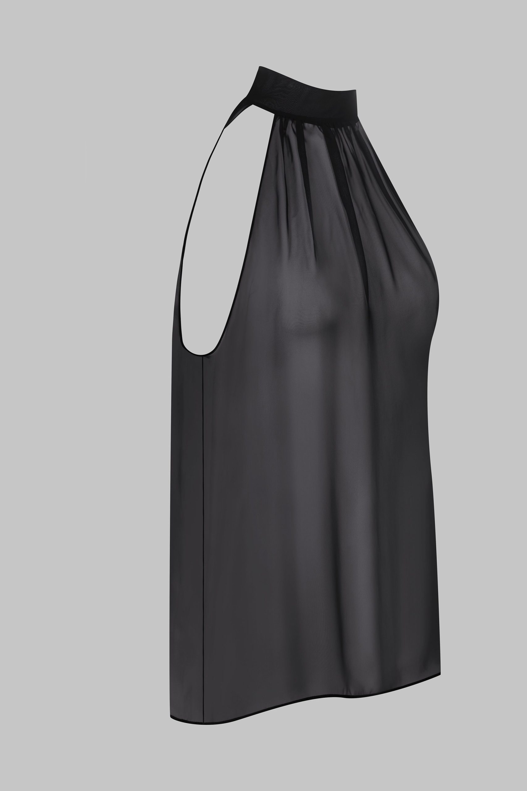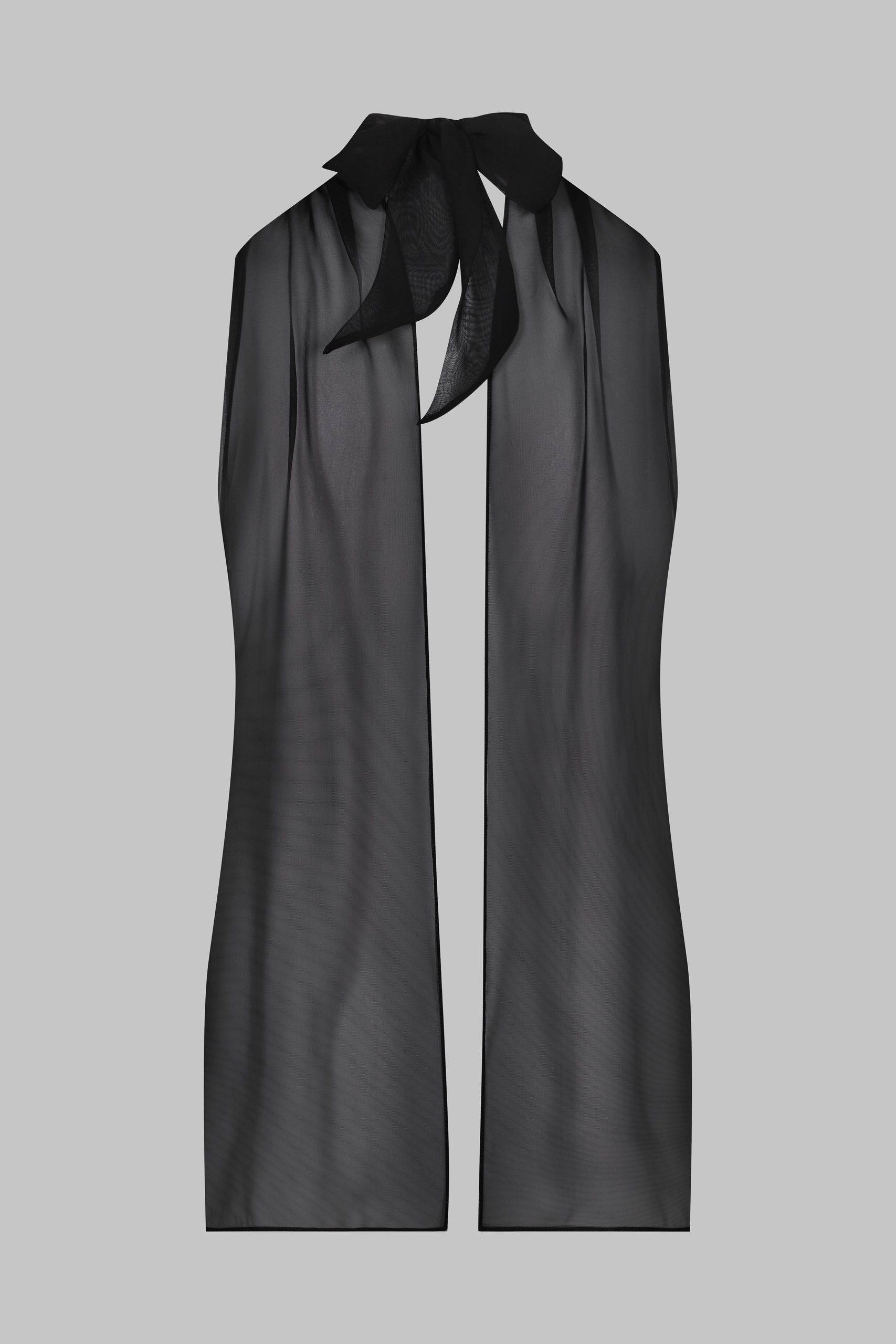Crafted from ultra-sheer, floaty chiffon, this daring garment draws attention with its flowing drape. Structured with American-style armholes and a high, delicately pleated tie-neck that you can tie to suit you.