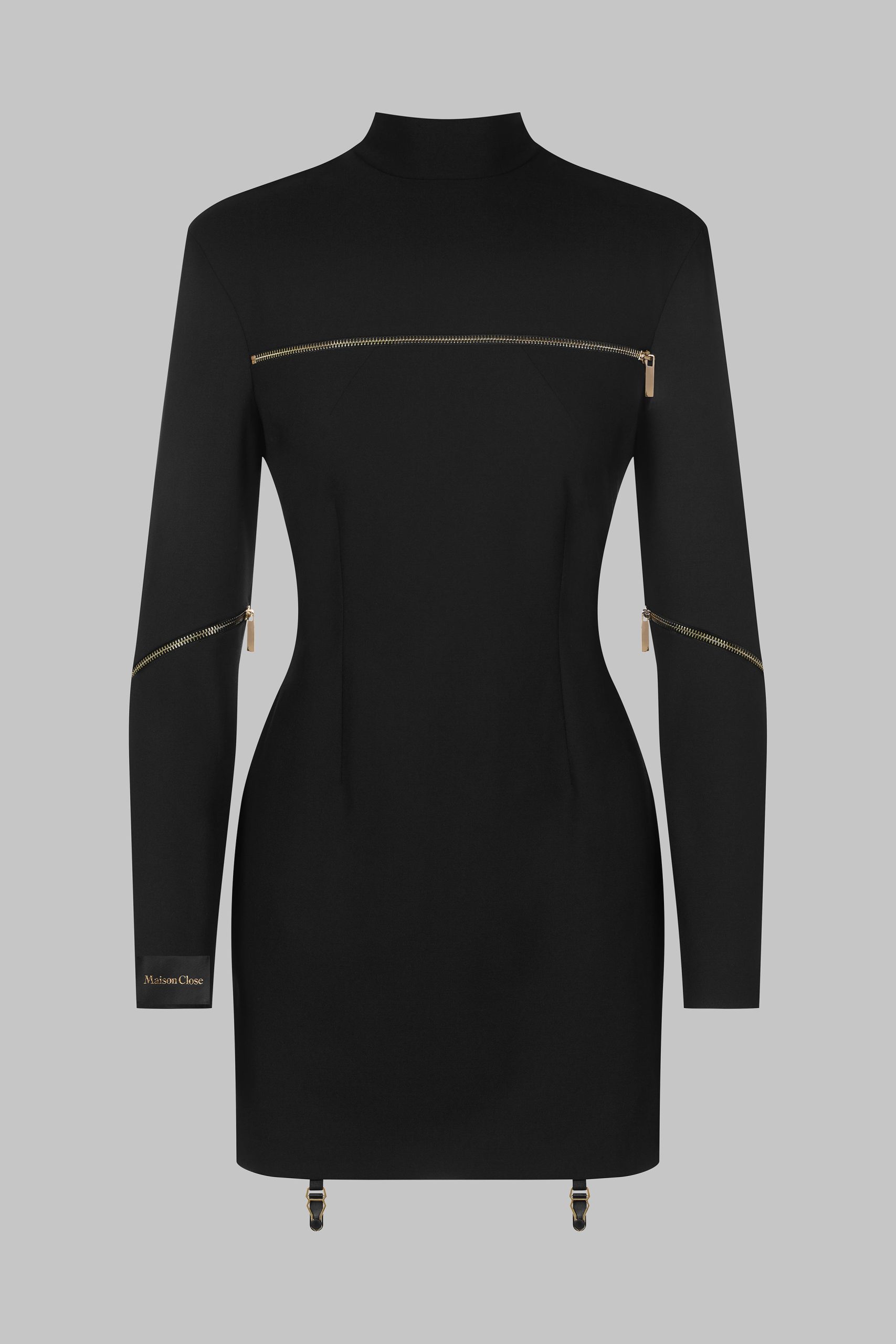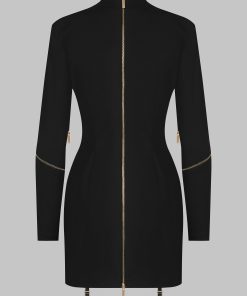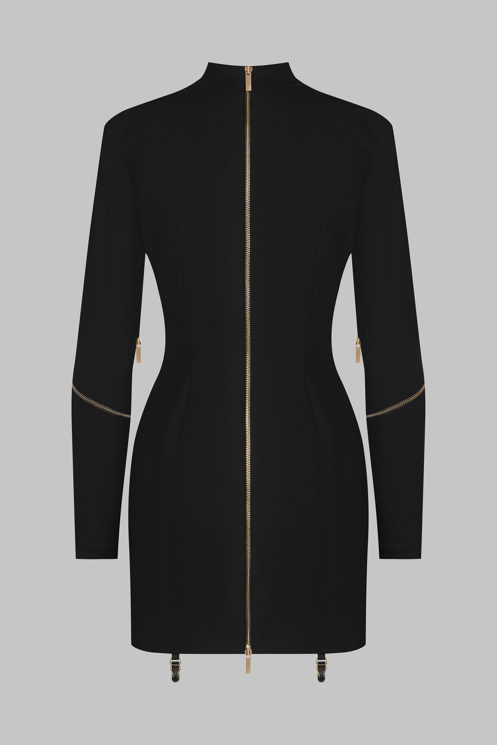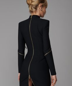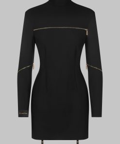 The dress is embellished at the neckline and elbows with openable gold-tone metal zips and a two-way zip fastening at the back to ensure a perfect fit and elegantly emphasise your curves. The high neck and straight sleeves give this dress a sophisticated look.