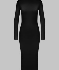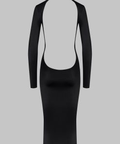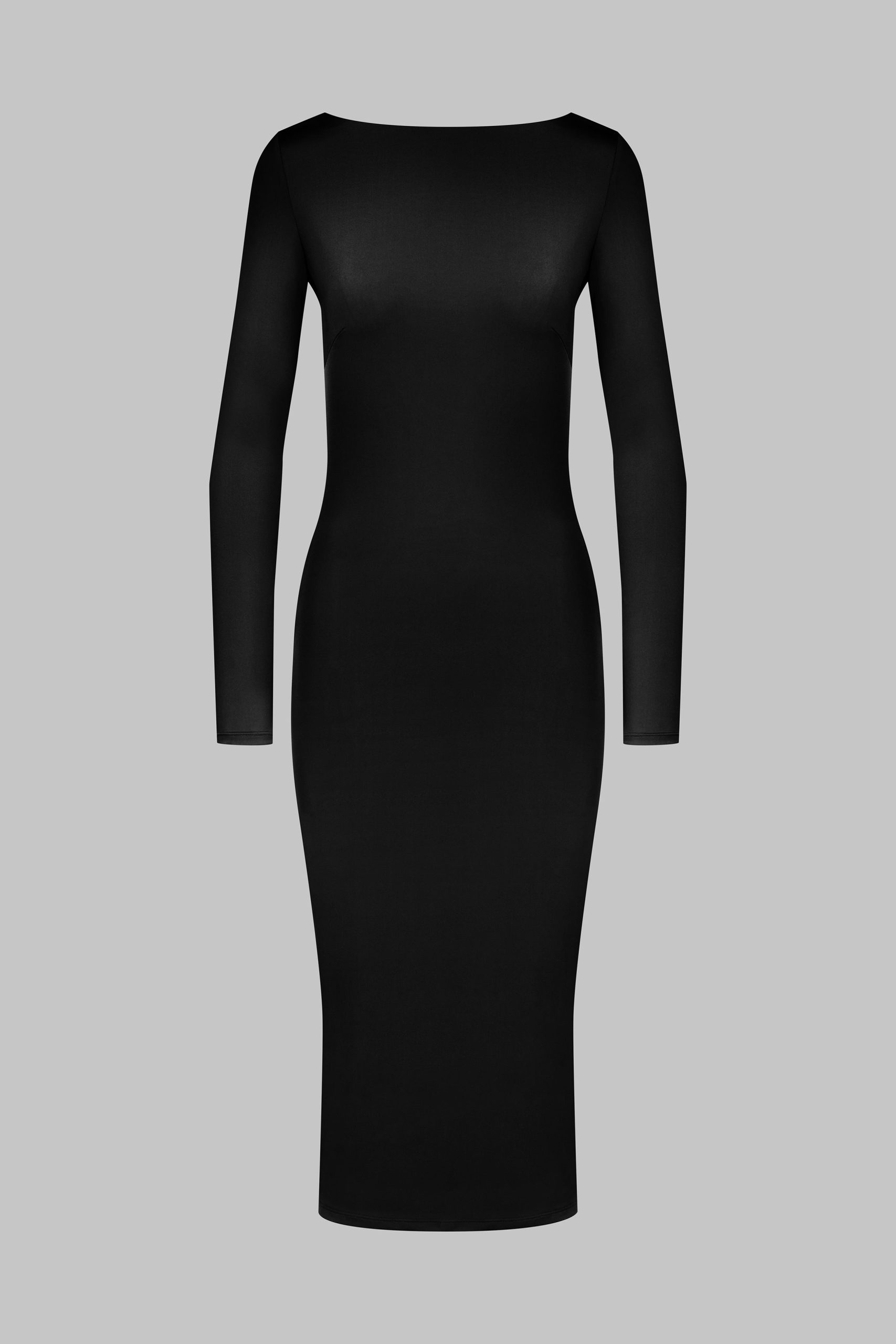 This backless dress stands out for its body-hugging midi cut, which hugs the body and creates a sleek, assertive silhouette. Made from opaque stretch jersey, it has long sleeves and a plunging back that really turns heads. It fastens at the nape of the neck with double removable and adjustable suspenders with Maison Close lettering embellished with unique gold jewellery clips. The seamless boat neck emphasises a graceful neck.