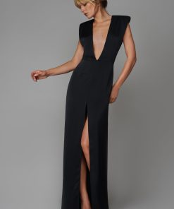 This long dress is characterised by its straight cut and fitted waist. The striking satin-lined shoulder pads create a strong, structured silhouette. It is made from double-sided opaque satin for softness, a flowing style and incomparable quality. It has a seductive look with its double deep V neckline at the front and back. In the centre, a bold slit shows off the front of the legs. An invisible zip fastening on the side emphasises the impeccable fit of the waist.