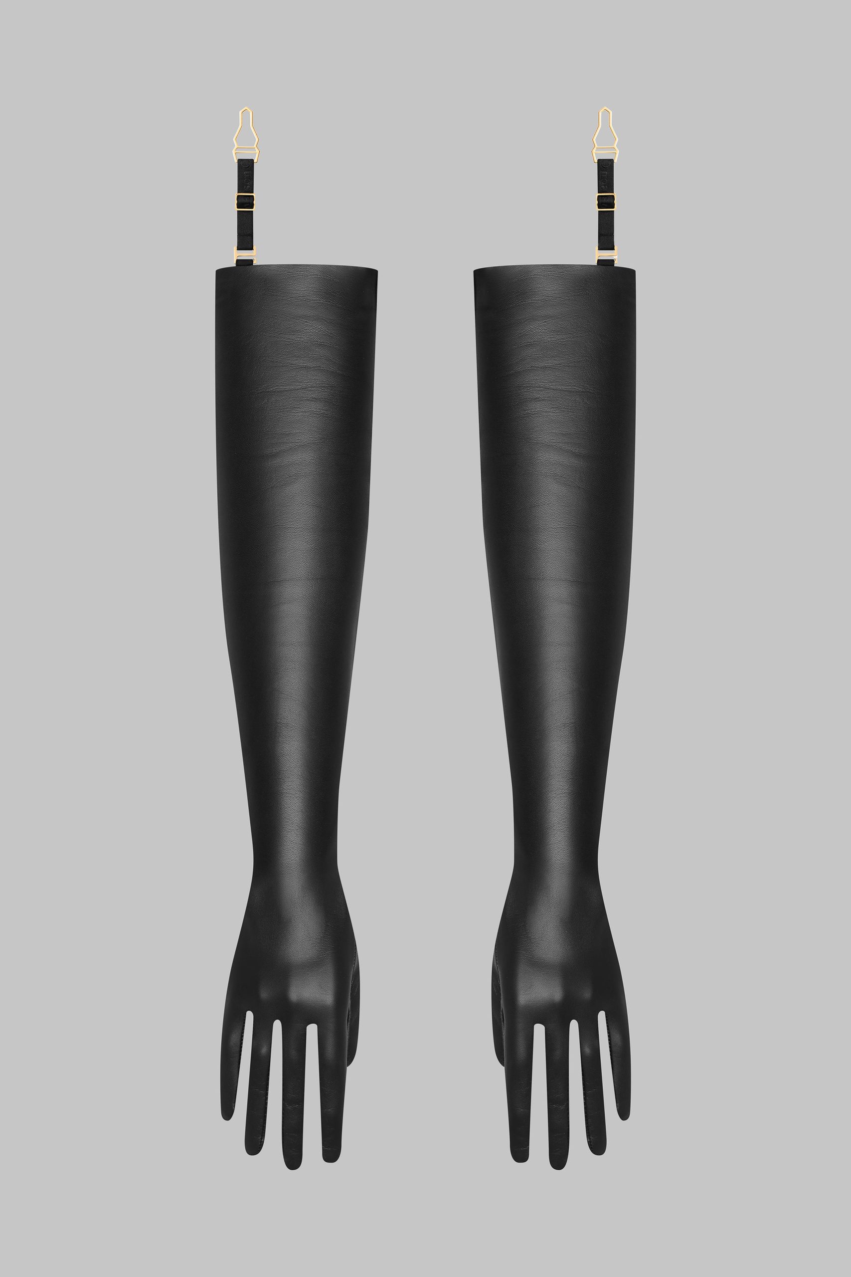 Opera gloves in Italian nappa leather with silk lining add the ultimate touch of luxury to your outfits. A set of removable, adjustable suspenders by Maison Close create an even more assertive look.