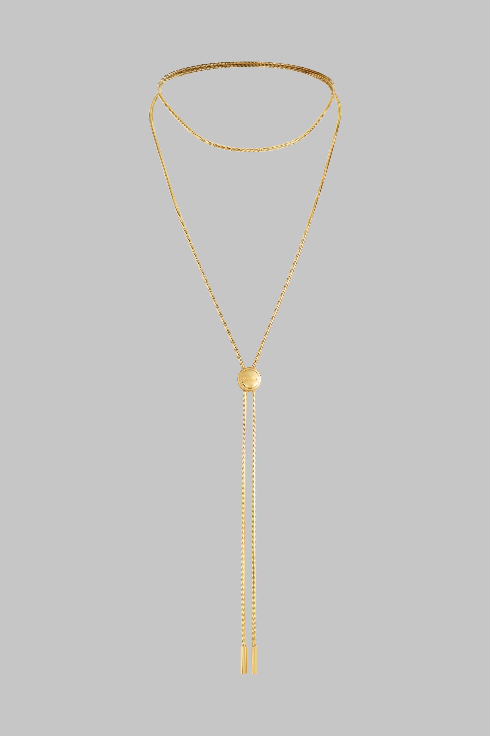 A striking body jewel, the Bolo Tie Chain À Ton Cou traces sensuality in motion. Its 130 cm golden chains glide over bare skin, slipping between the breasts or following the curve of the back. The sliding jewel, engraved with the Maison Close seal, rests at the nape of the neck or across the chest for a perfectly precise fit.