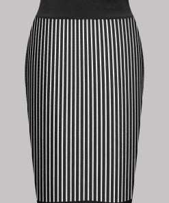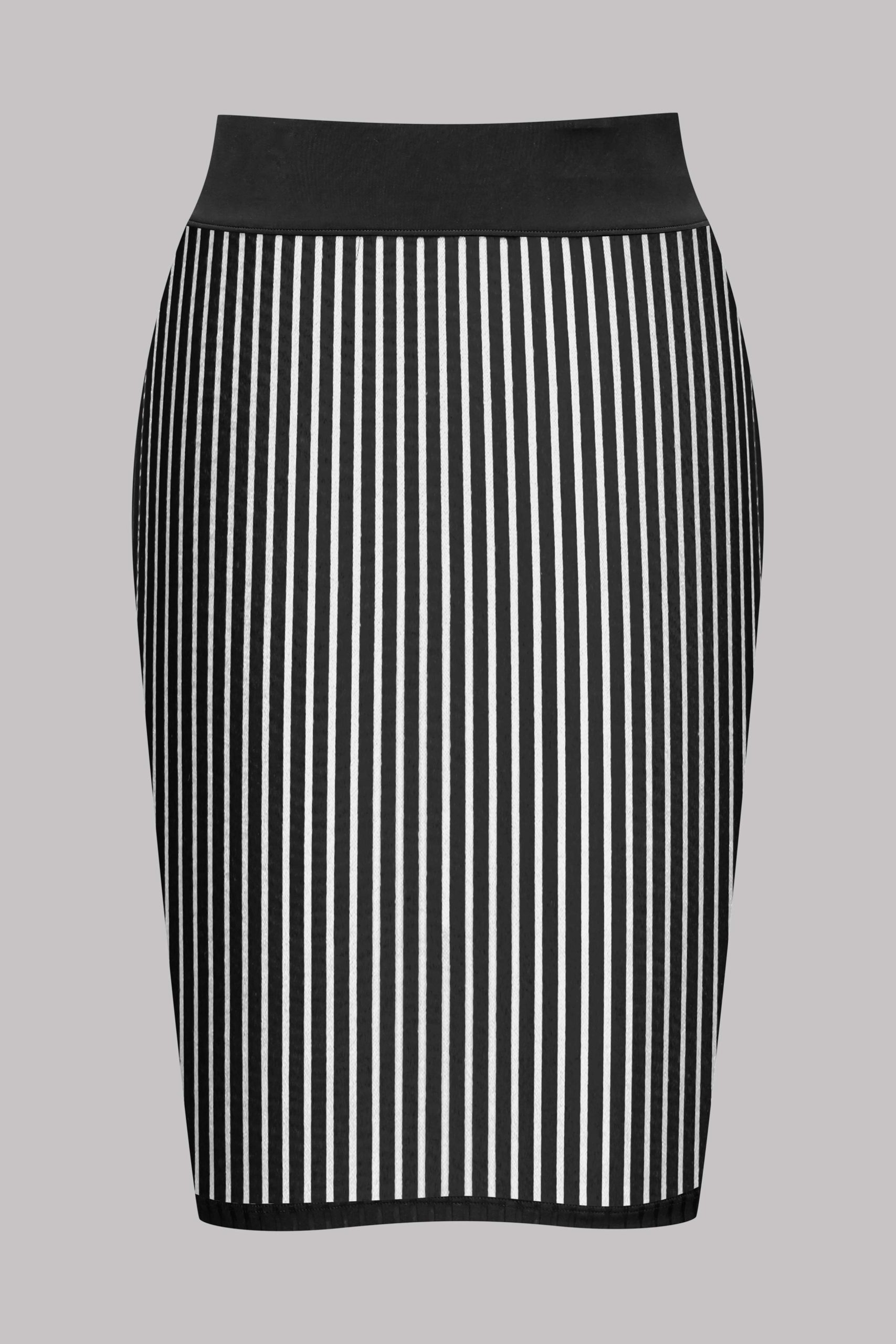 Microfibre mid-length skirt with openwork, transparency and graphic stripes that sculpts the figure. A wide elastic waistband plain black microfibre-covered structures the waist.