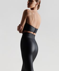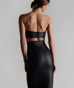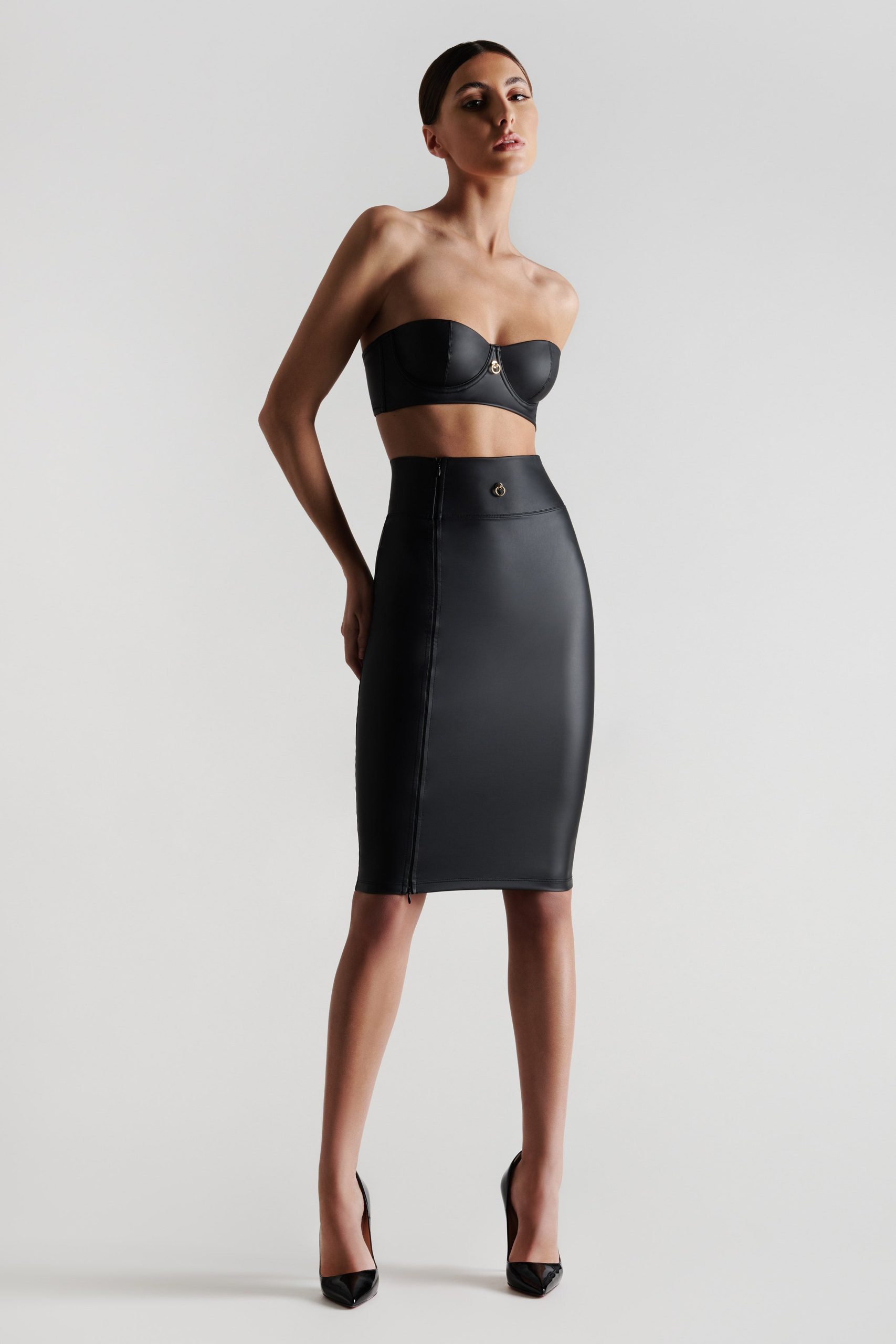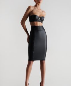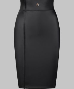 Matte leather effect skirt Bodycon cut and wide belt to show off the figure. Opens at the front with a tone-on-tone two-way zip. The collection’s signature golden “feti-chic” ring embellishes the front, inviting you to attach it.