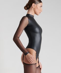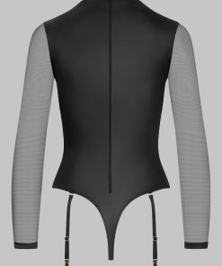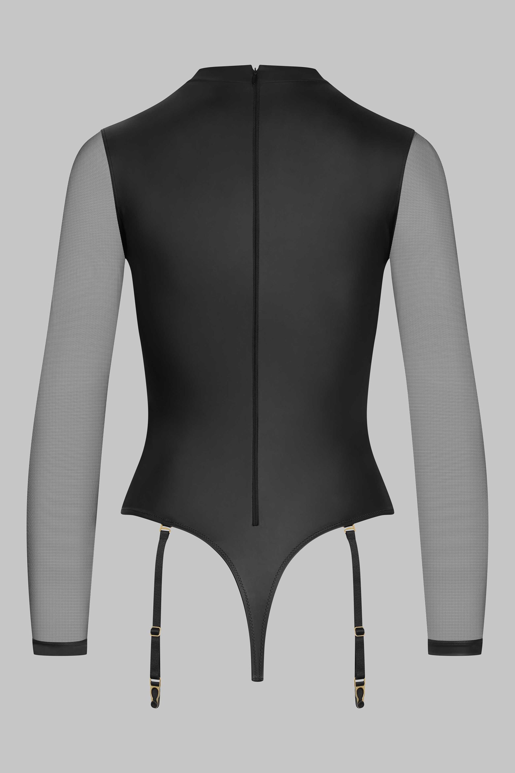 Matte leather effect and sheer tulle long sleeve G-string bodysuit Opens at the back with a tone-on-tone zip. 4 adjustable and removable suspender straps with golden ornamental trims. The collection’s signature “feti-chic” ring embellishes the neck, inviting you to attach it.