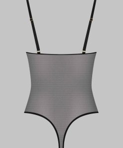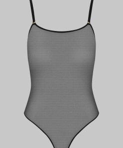 This black colour thong body features soft mesh with a sheer iridescent appearance.