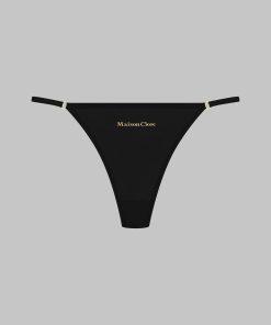 Mini thong crafted from fine jersey with shimmering, subtly sheer highlights. Trimmed with an ultra-flat elasticated band that’s invisible under clothes. Delicate elasticated bands connected by a golden ring at the back. The gold signature of the Maison Close logo appears on the front.