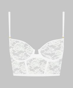 This balconette bra features mostly recycled openwork lace. Underwired cups that fit and shape the breasts perfectly. Bustier design with flexible vertical boning in the front and back. Fastens at the back with a smooth, subtle adjustable clip. Signature adjustable and removable straps with gold accessories. Swap whenever you like with any other Signature straps available in various colours. An opportunity for each Muse to create their own unique mix and match.