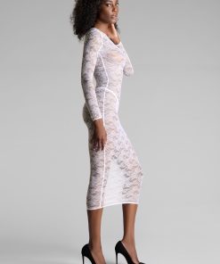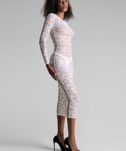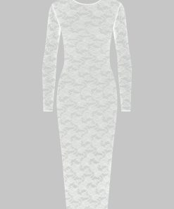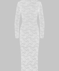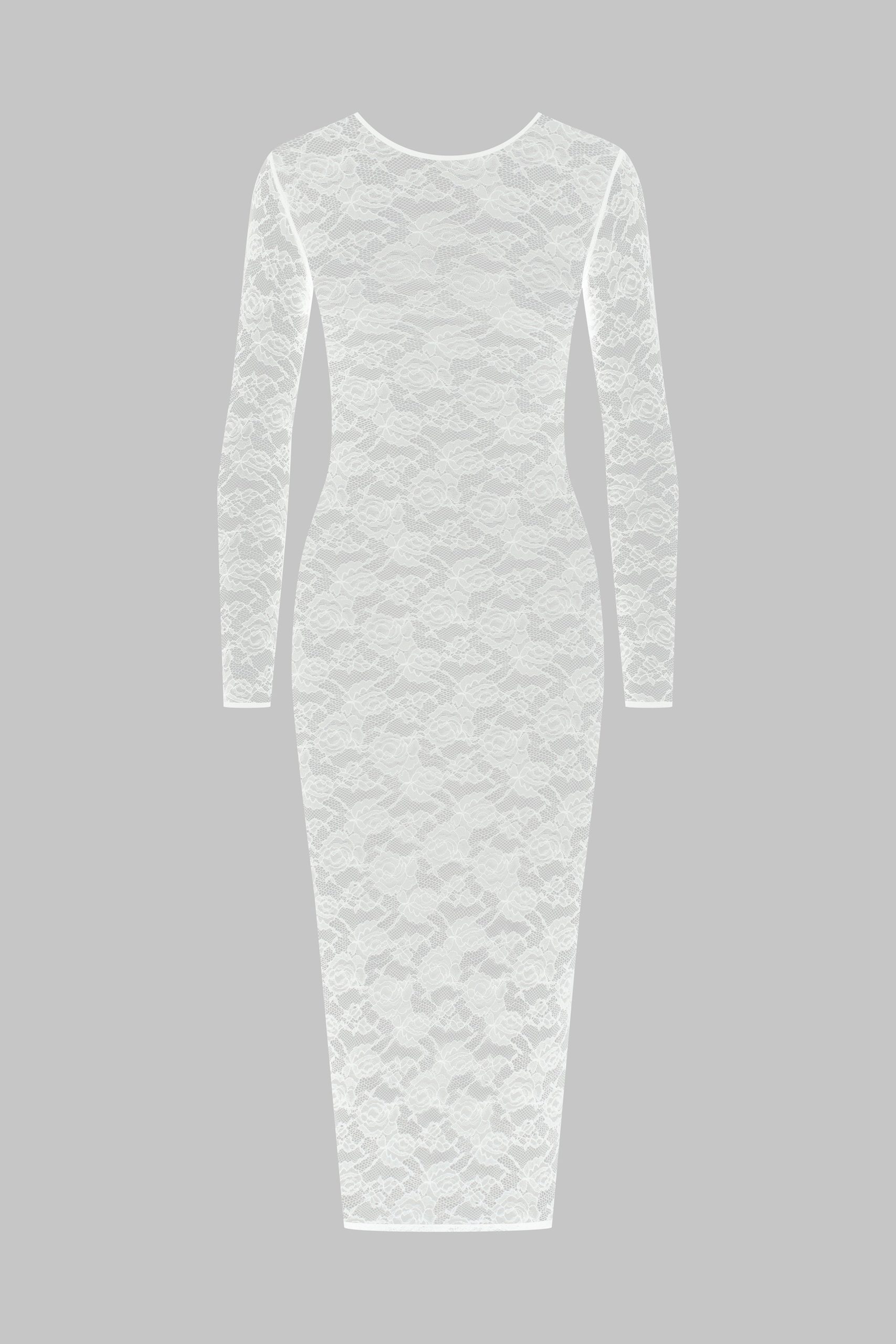 This long-sleeved dress features mostly recycled openwork lace. Fitted style with flat elasticated trim. The midi length accentuates your curves for a confident ’80s style.