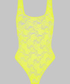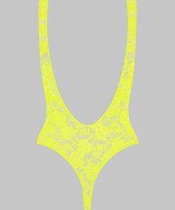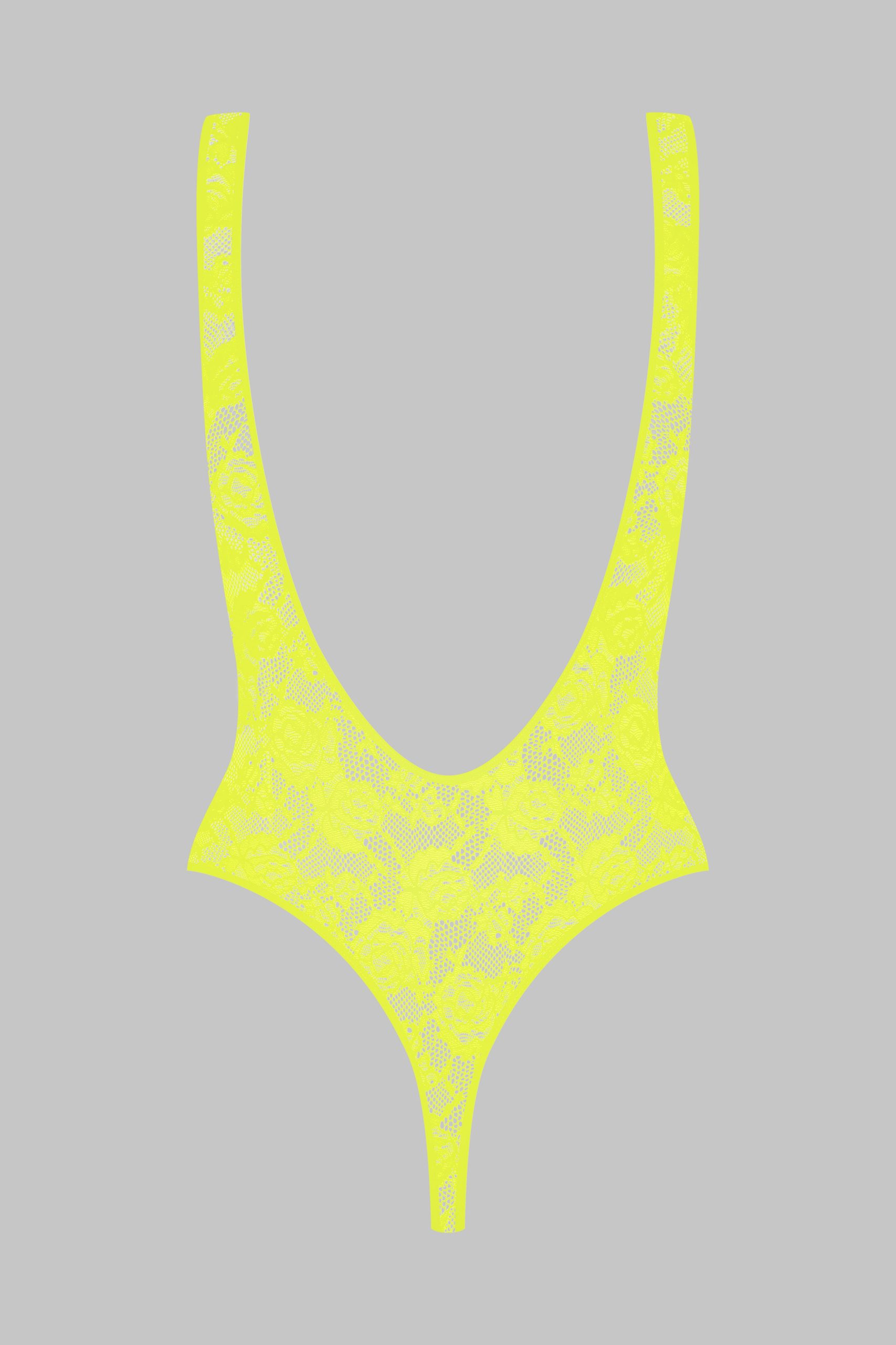 This neon-coloured thong bodysuit features mostly recycled openwork lace. Wide straps reveal a backless design with flat elasticated trim. Fitted cut edged with flat elasticated trim. Its plunging neckline, accentuated armholes and bold backless style take us back to the ’80s. Wear on its own or under a garment from the Maison Close wardrobe.