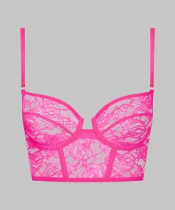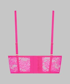 This neon-coloured balconette bra features mostly recycled openwork lace.Underwired cups that fit and shape the breasts perfectly. Bustier design with flexible vertical boning in the front and back. Fastens at the back with a smooth, subtle adjustable clip. Signature adjustable and removable neon straps with gold accessories. Swap whenever you like with any other Signature items available in various colours. An opportunity for each Muse to create their own zingy mix and match.