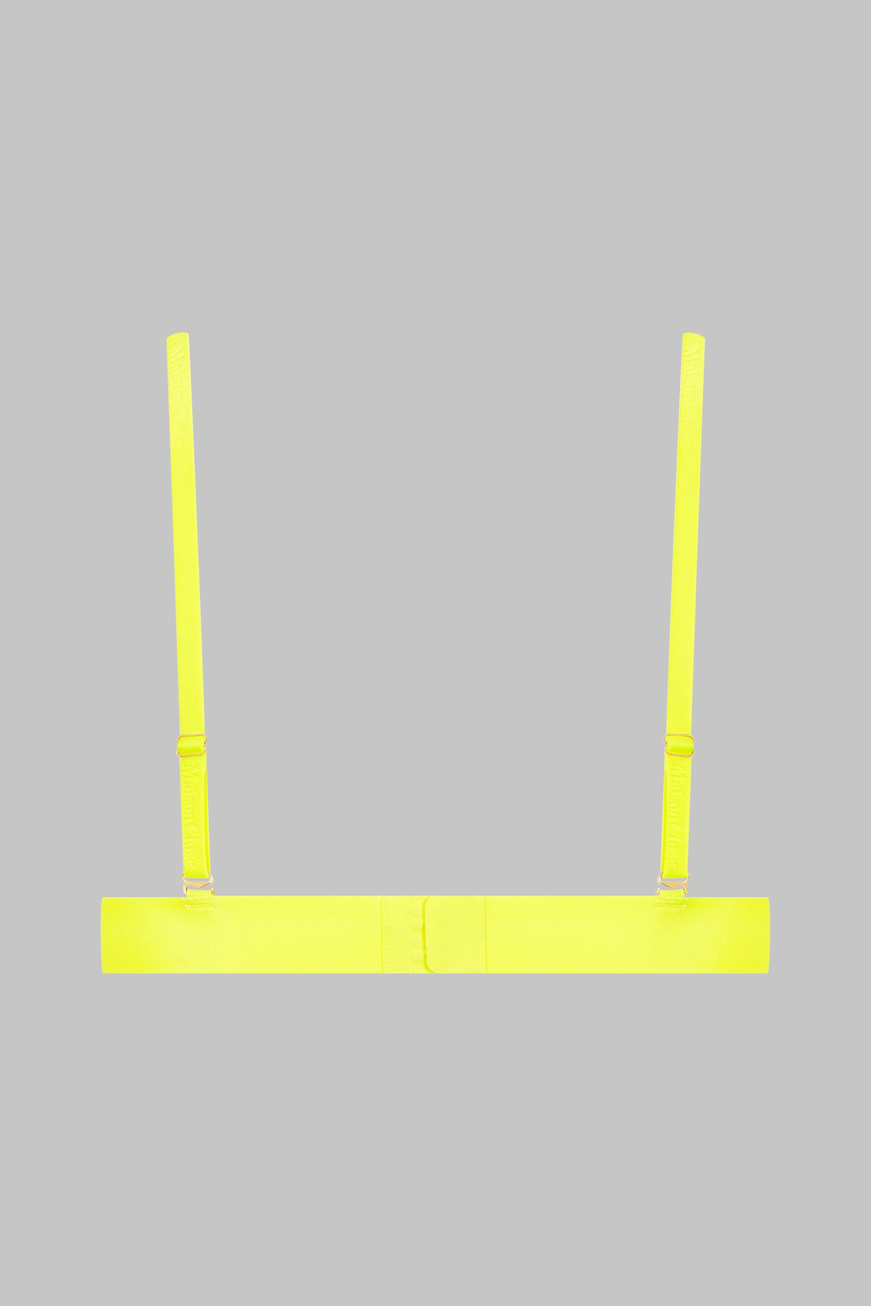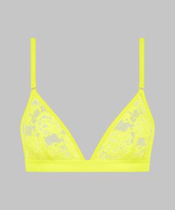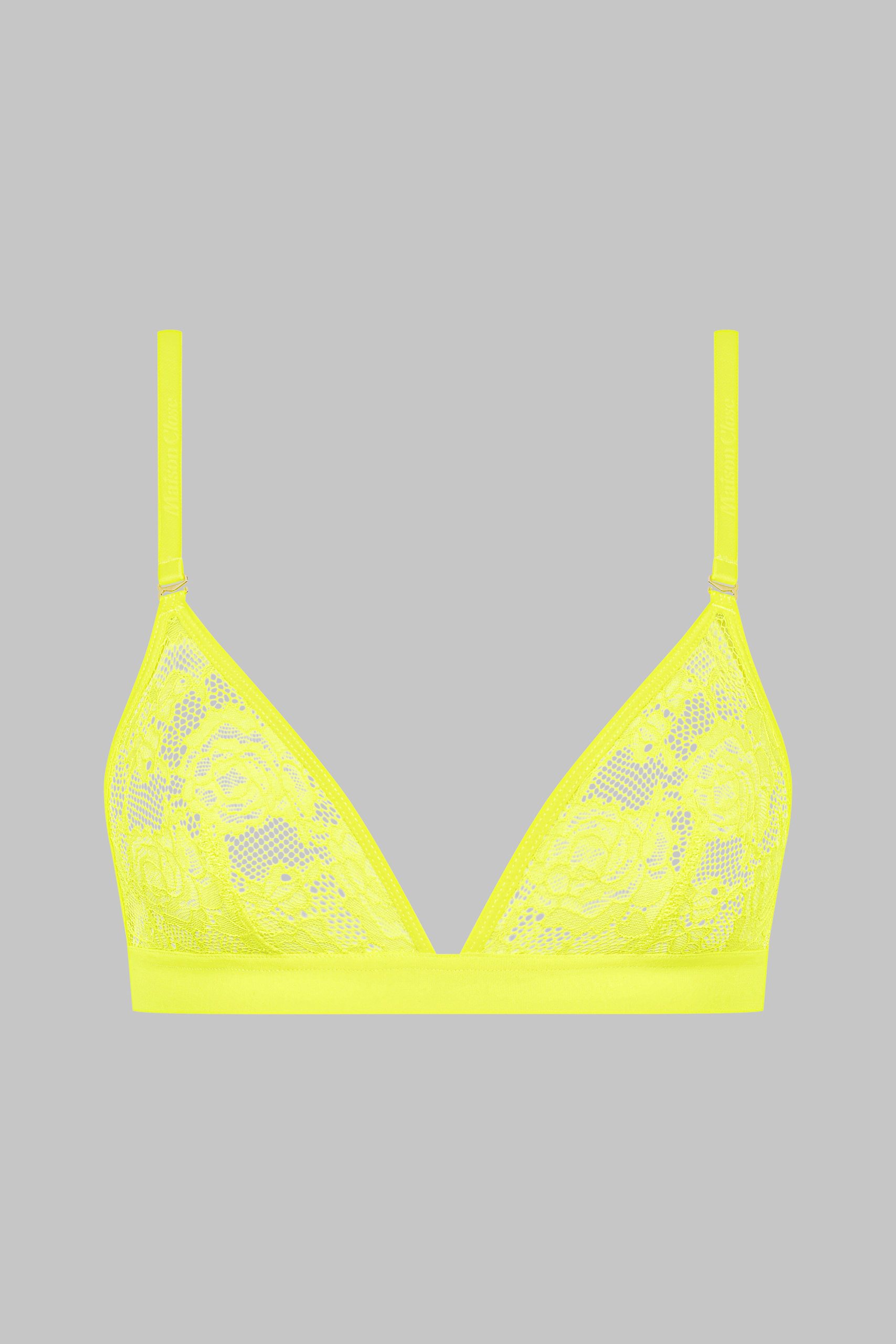 This triangle bra without underwiring in a fluorescent colour features mostly recycled openwork lace. Signature adjustable and removable neon straps with gold accessories. Swap whenever you like with any other Signature items available in various colours. An opportunity for each Muse to create their own zingy mix and match. Fastens at the back with a smooth, subtle adjustable clip.