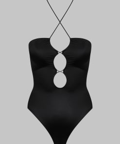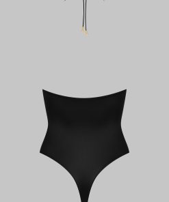 High-cut bandeau thong body, combining satin softness and elegant style. An 80s-style strapless cut beautifully enhanced by lacing detailing delicately pleated at the front, it offers adjustable, elegant openings thanks to a unique adjuster and gold lipstick accessories by Maison Close, to adjust as you wish. Adjustable hook-and-eye fastening at the crotch.