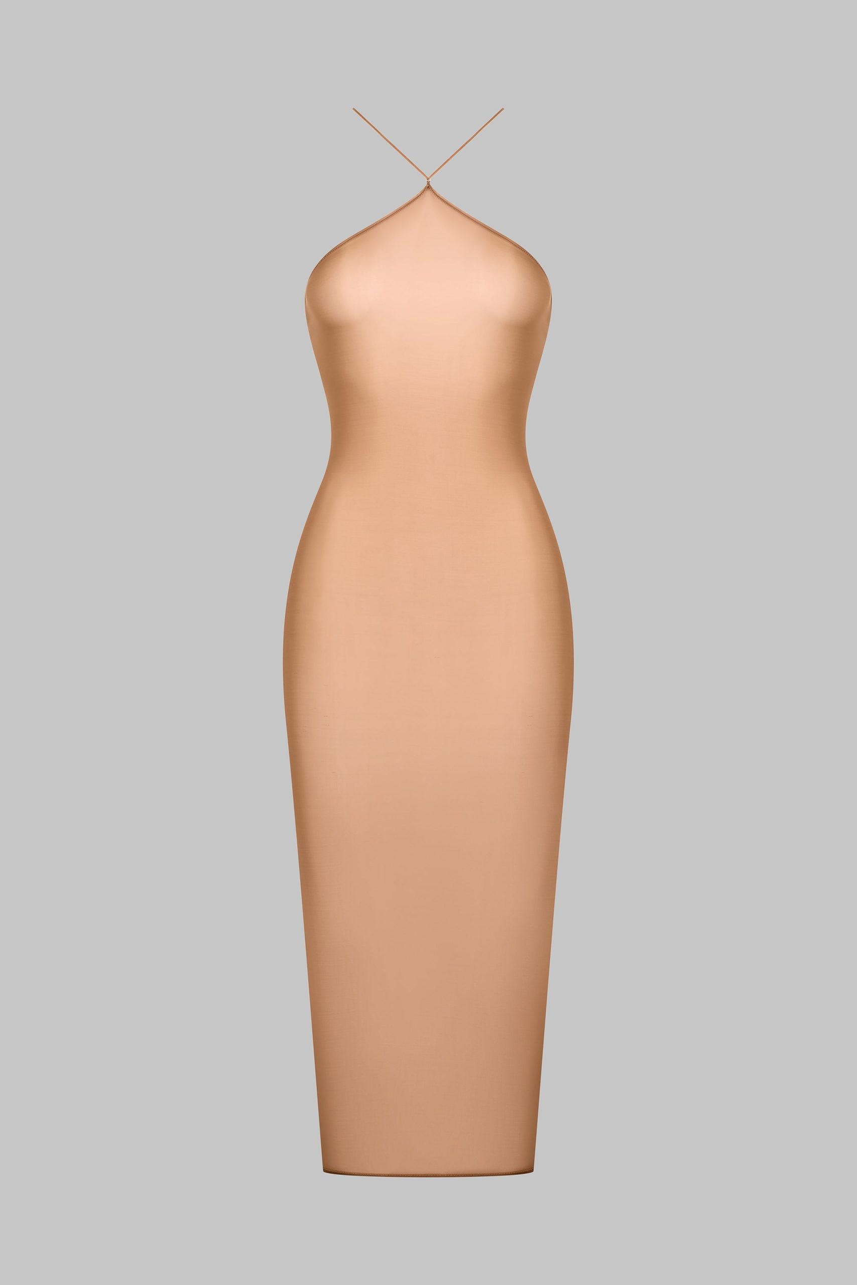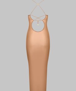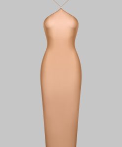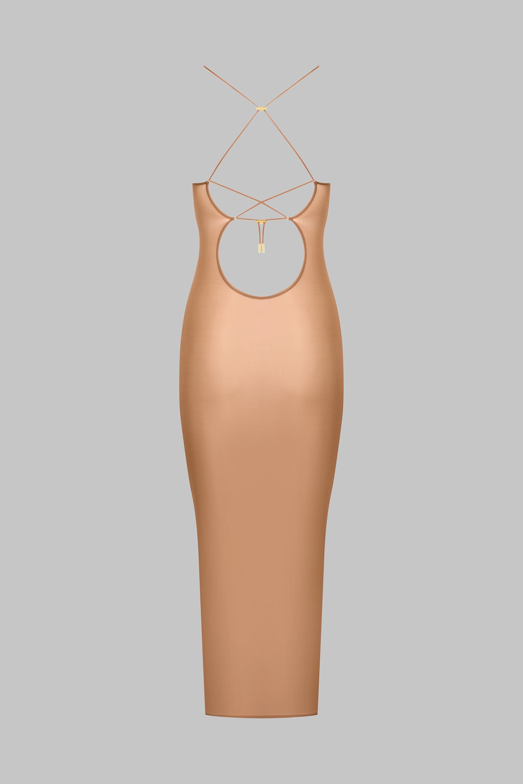 Midi-length dress with semi-halter neckline crafted from a fine jersey with shiny, subtly sheer reflections. The open back is enhanced by a lacing detail, and the halter neck is adjustable thanks to unique sliders and gold lipstick accessories signed by Maison Close.