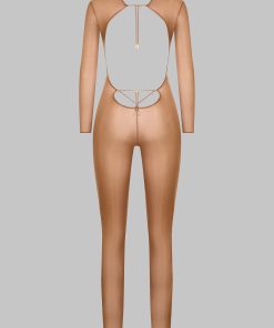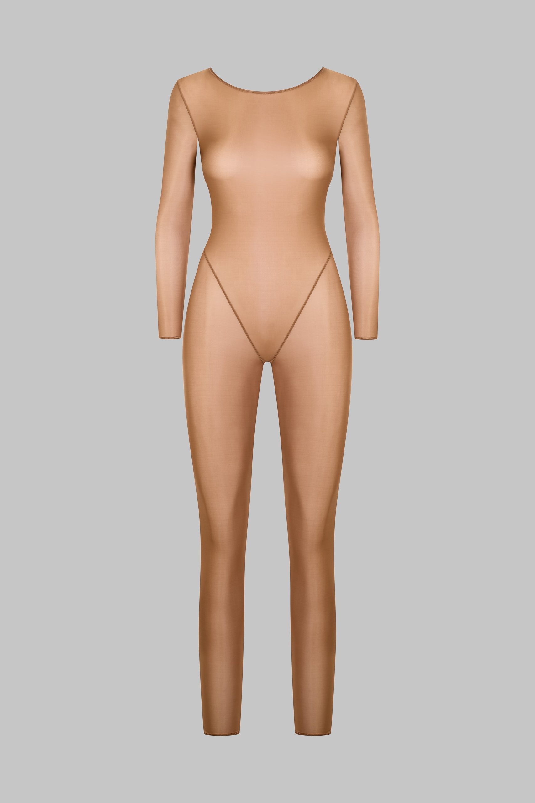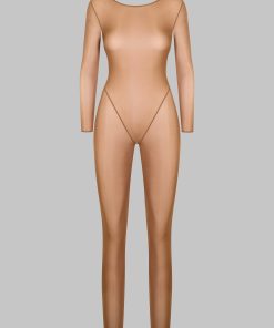 Long sleeve catsuit with round neckline crafted from a fine jersey with shiny, subtly sheer reflections. The front reveals a minimalist and refined silhouette, while the back is fully exposed down to the small of the back with delicately ruched lacing at the neck. The lacing is adjustable thanks to unique sliders and gold lipstick accessories signed by Maison Close.