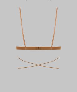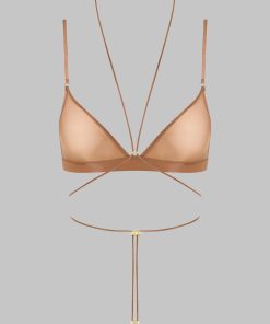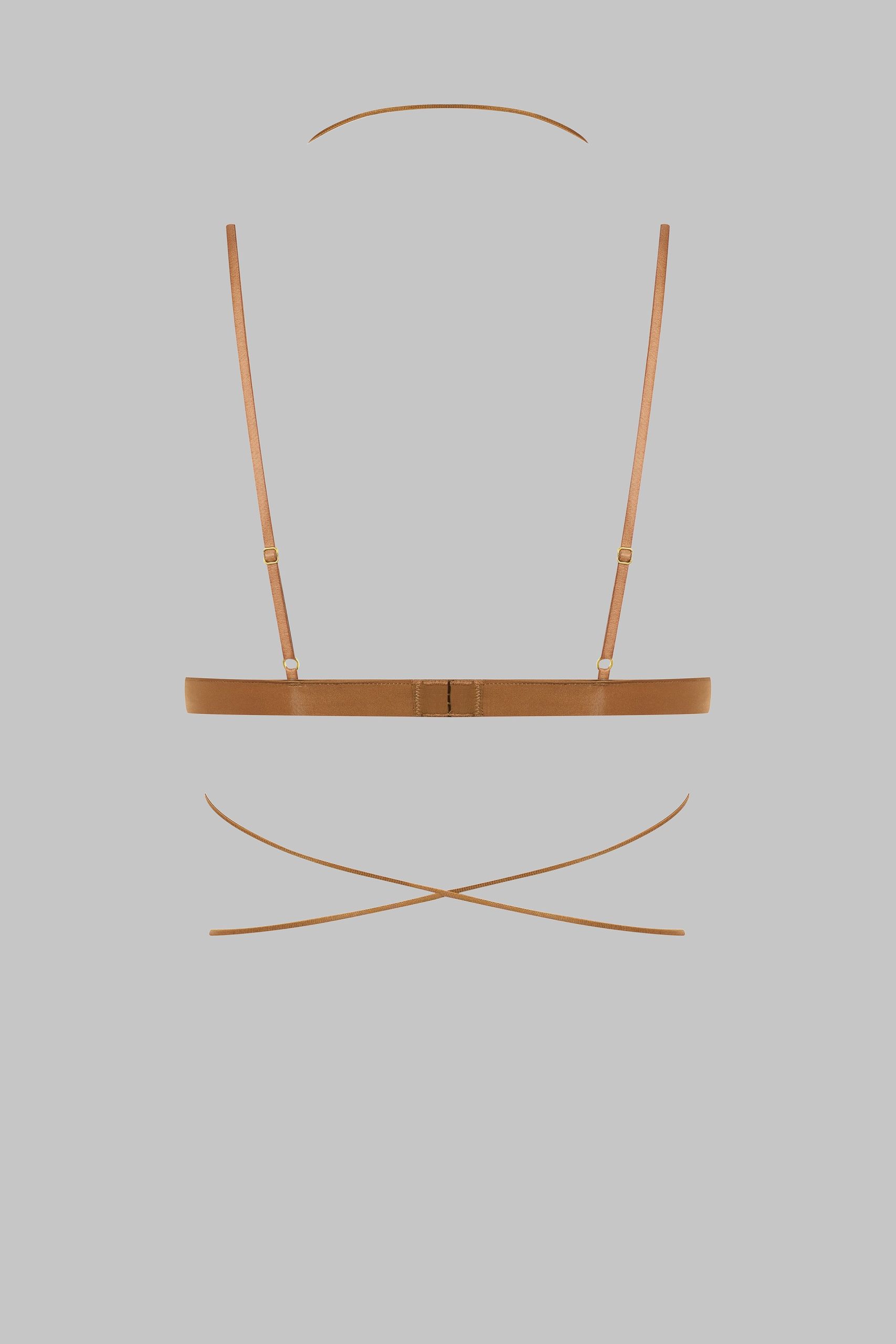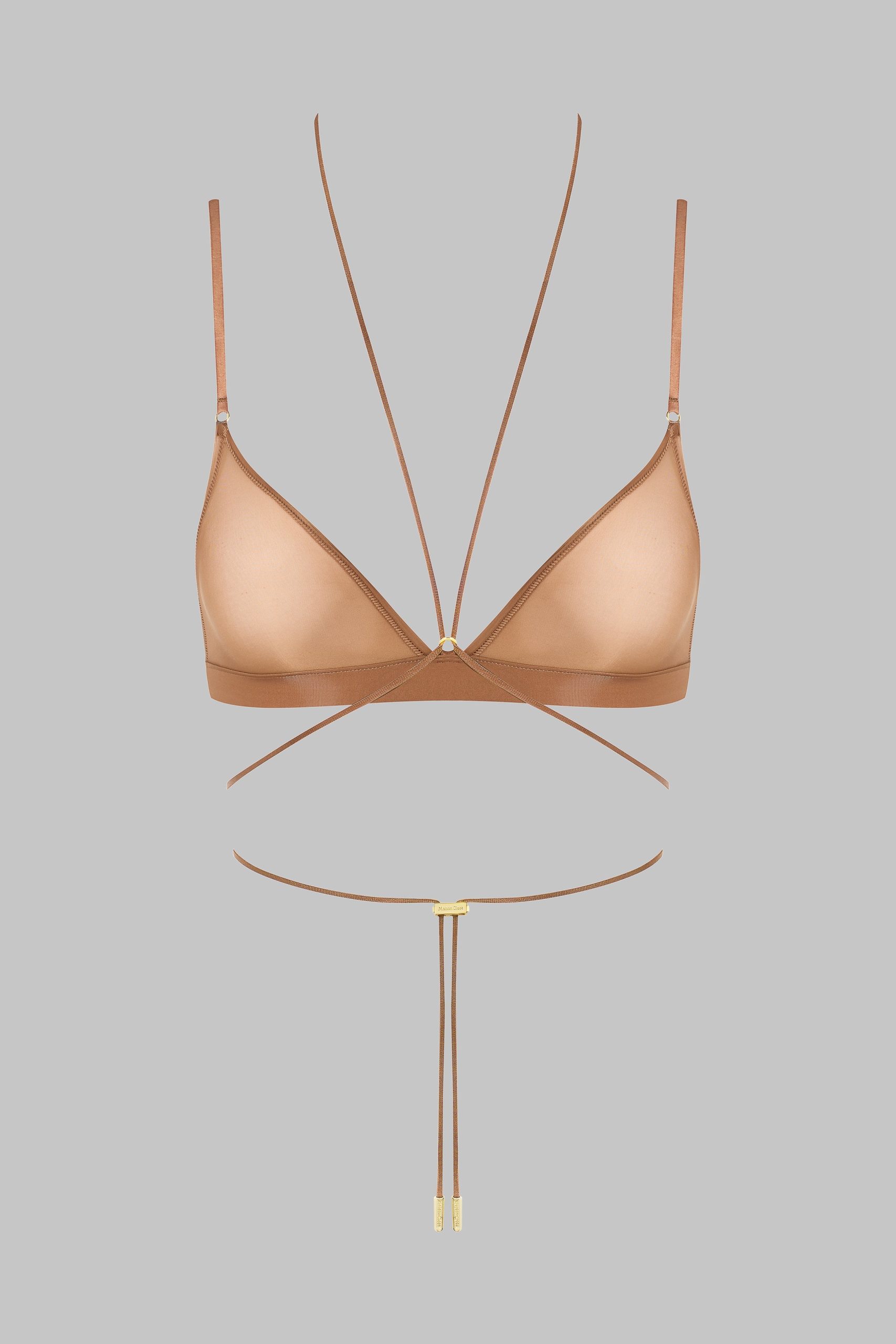 Wireless triangle bra crafted from a fine jersey with shiny, subtly sheer reflections. Designed to perfectly fit the shape of the breasts with seamless molded triangle cups. The halter lacing is fully removable and adjustable thanks to a unique slider and gold lipstick accessories signed by Maison Close, enhancing your neckline and allowing for personalized styling. Thin, flat adjustable straps ensure a perfect fit. An elastic underband hugs and sculpts the bust. Adjustable hook-and-eye closure at the back.