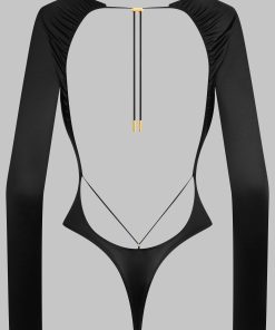 Long-sleeved high-cut thong body, combining satin softness and unique style. A suggestive plunging V-neckline beautifully enhances the figure. The back is completely revealed by lacing detailing delicately pleated to the small of the back. The lacing at the neck is adjustable thanks to a unique adjuster and gold lipstick accessories by Maison Close. Adjustable hook-and-eye fastening at the crotch.