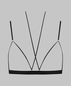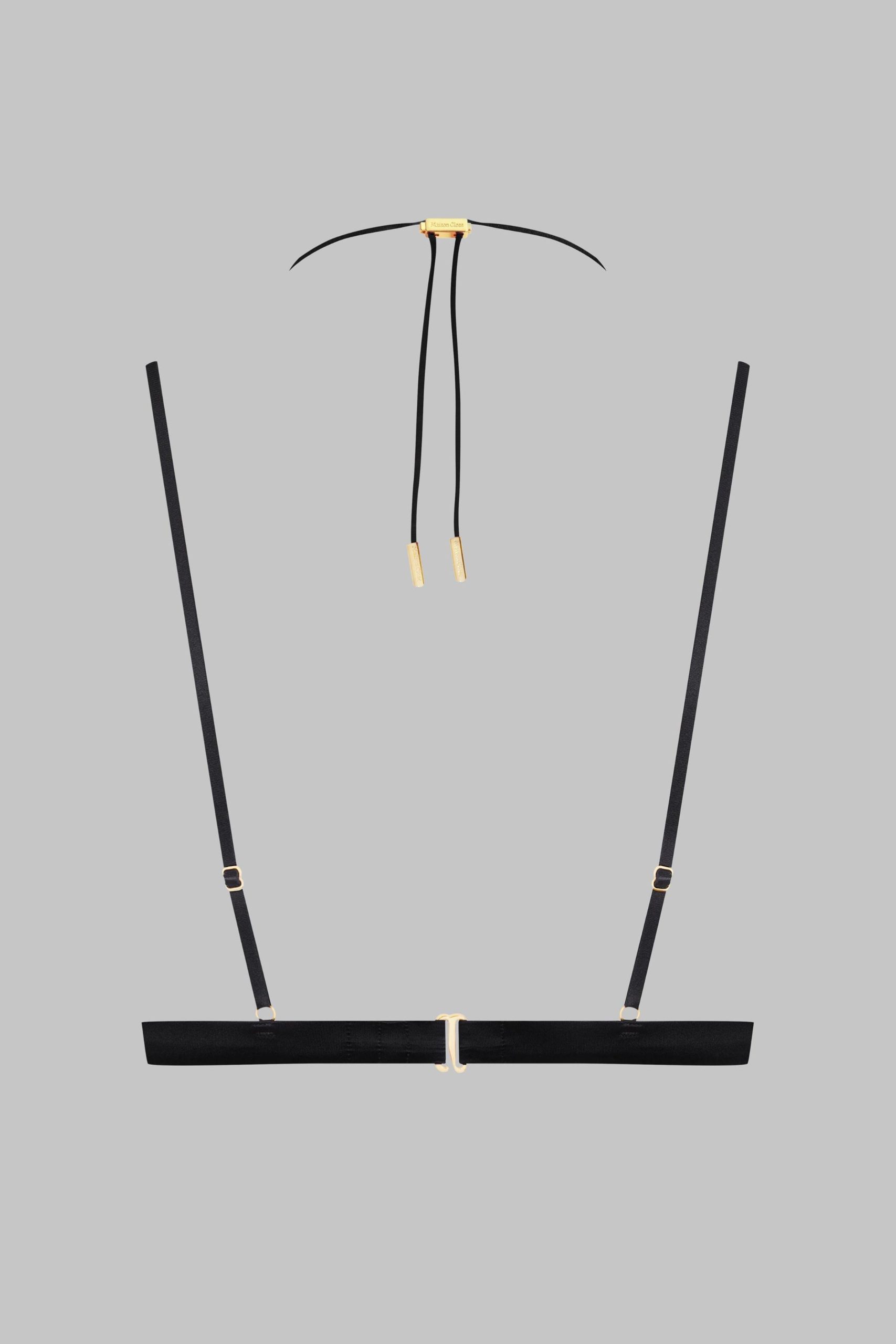 Open triangle bra, combining satin softness and daring. Designed to reveal the breasts in style. Repositionable and adjustable thanks to a unique adjuster and gold lipstick accessories by Maison Close, the lacing around the neck enhances your décolleté while allowing you to personalise it as you wish. The flat and adjustable fine straps ensure a perfect fit. An elasticated band around the chest structures the bust. Adjustable hook fastening at the back.