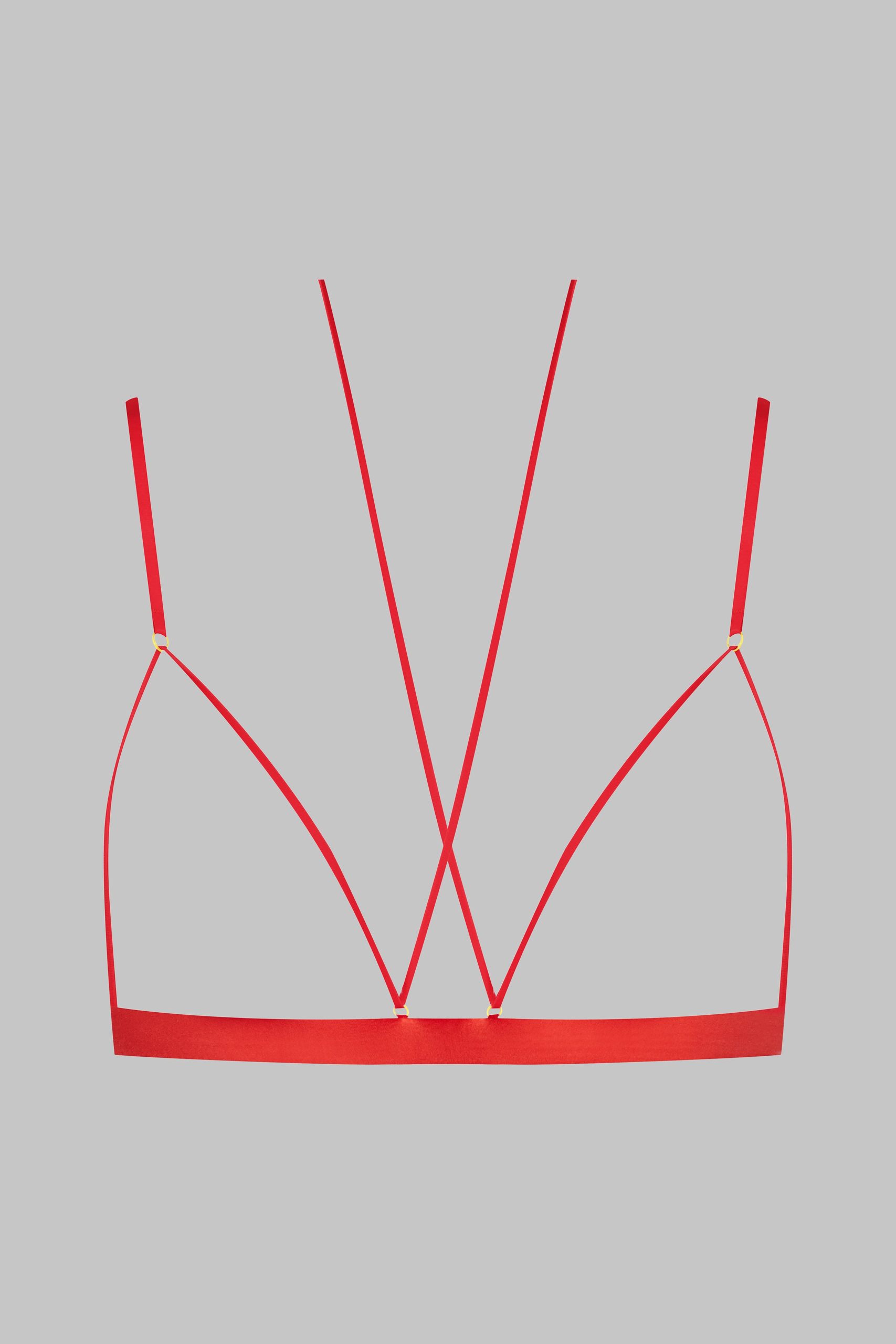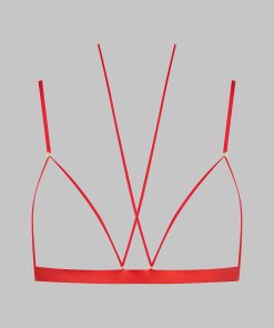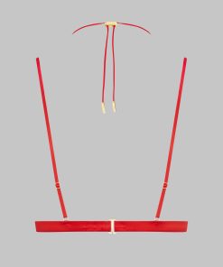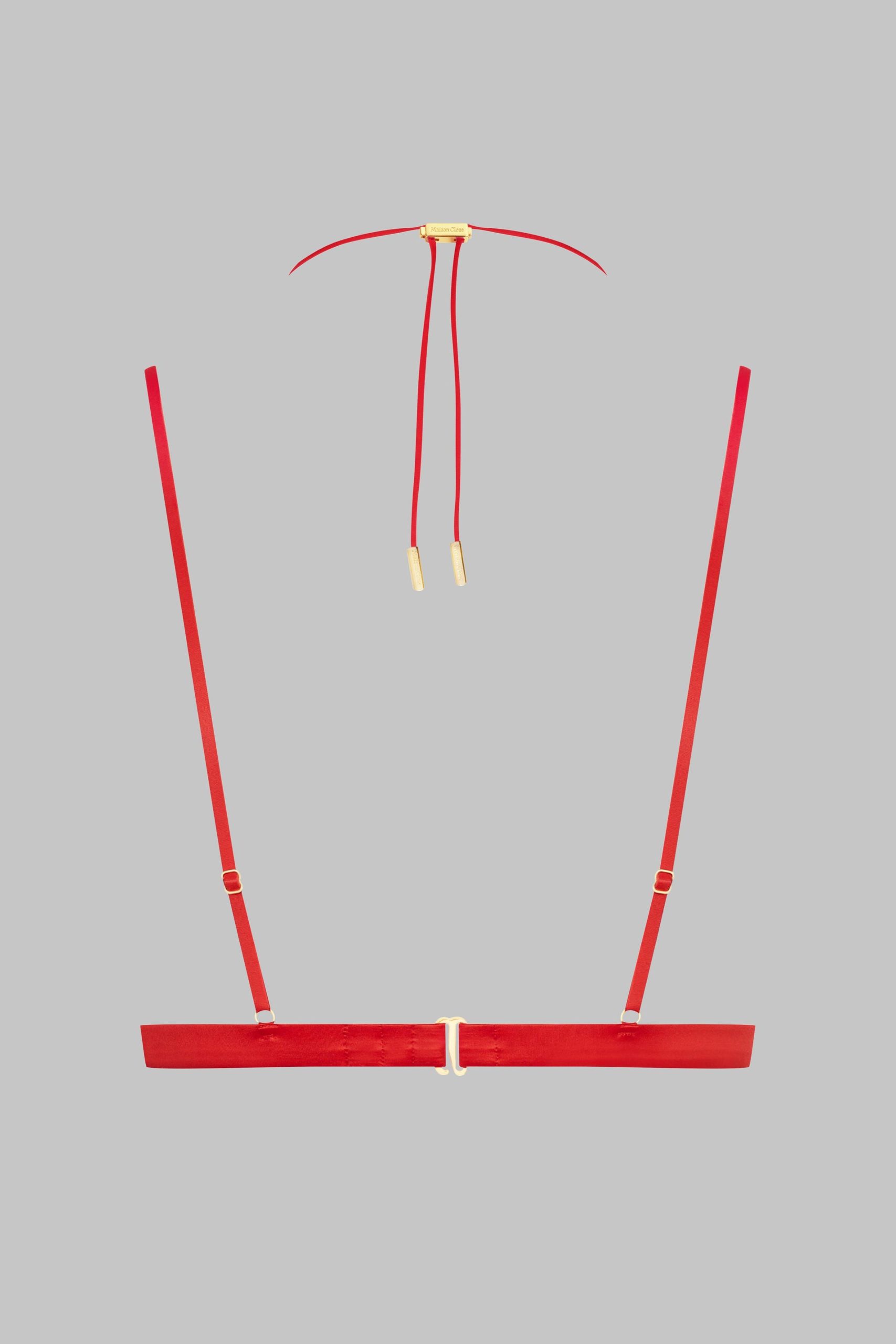 Open triangle bra, combining satin softness and daring. Designed to reveal the breasts in style. Repositionable and adjustable thanks to a unique adjuster and gold lipstick accessories by Maison Close, the lacing around the neck enhances your décolleté while allowing you to personalise it as you wish. The flat and adjustable fine straps ensure a perfect fit. An elasticated band around the chest structures the bust. Adjustable hook fastening at the back.