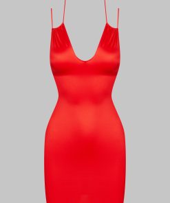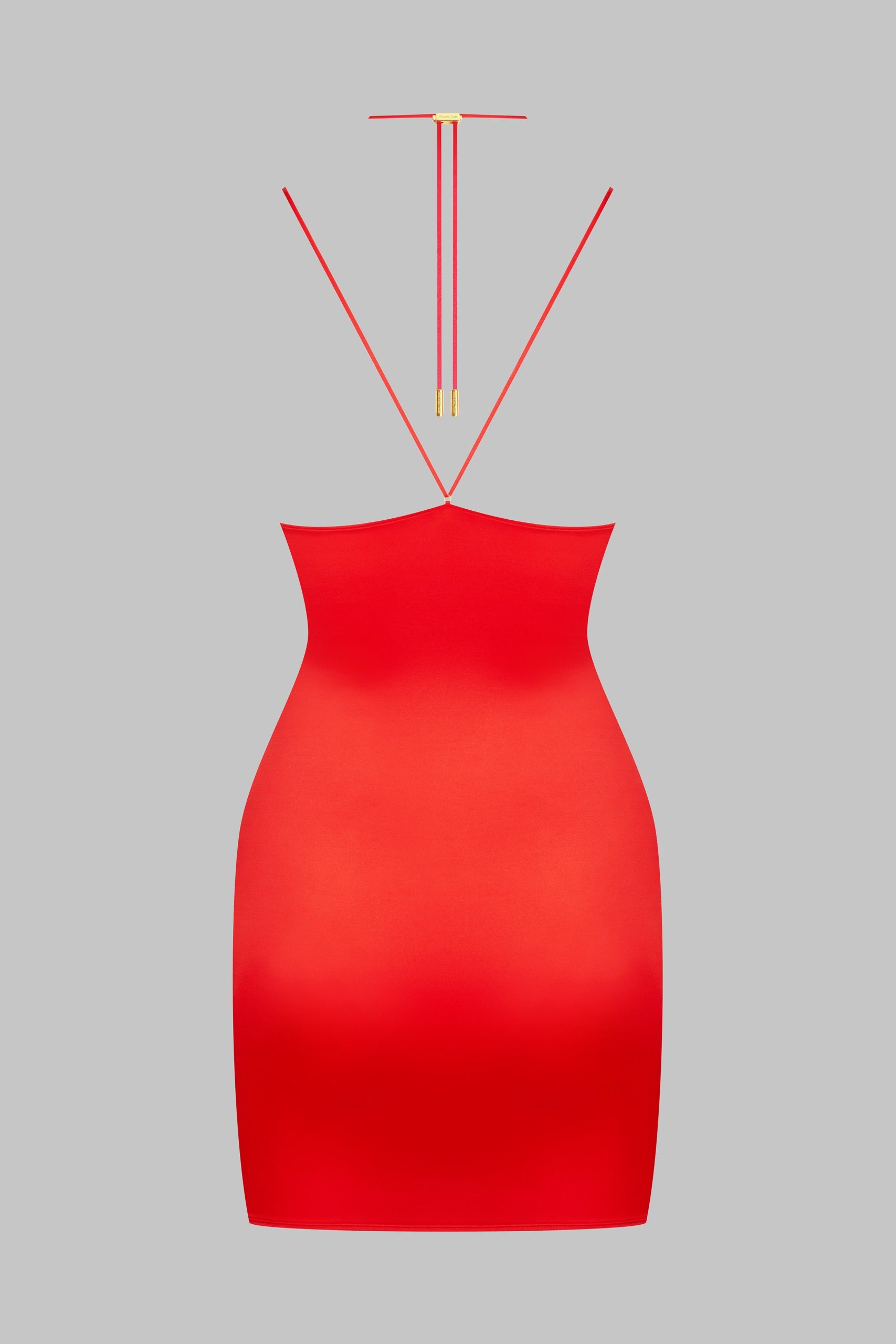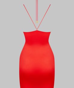 Short dress, combining satin softness and unique style. Neckline structured with subtle pleating. Repositionable and adjustable thanks to a unique adjuster and gold lipstick accessories by Maison Close, the lacing around the neck enhances the décolleté and back while allowing you to personalise it as you wish.