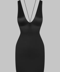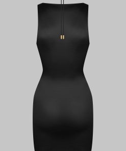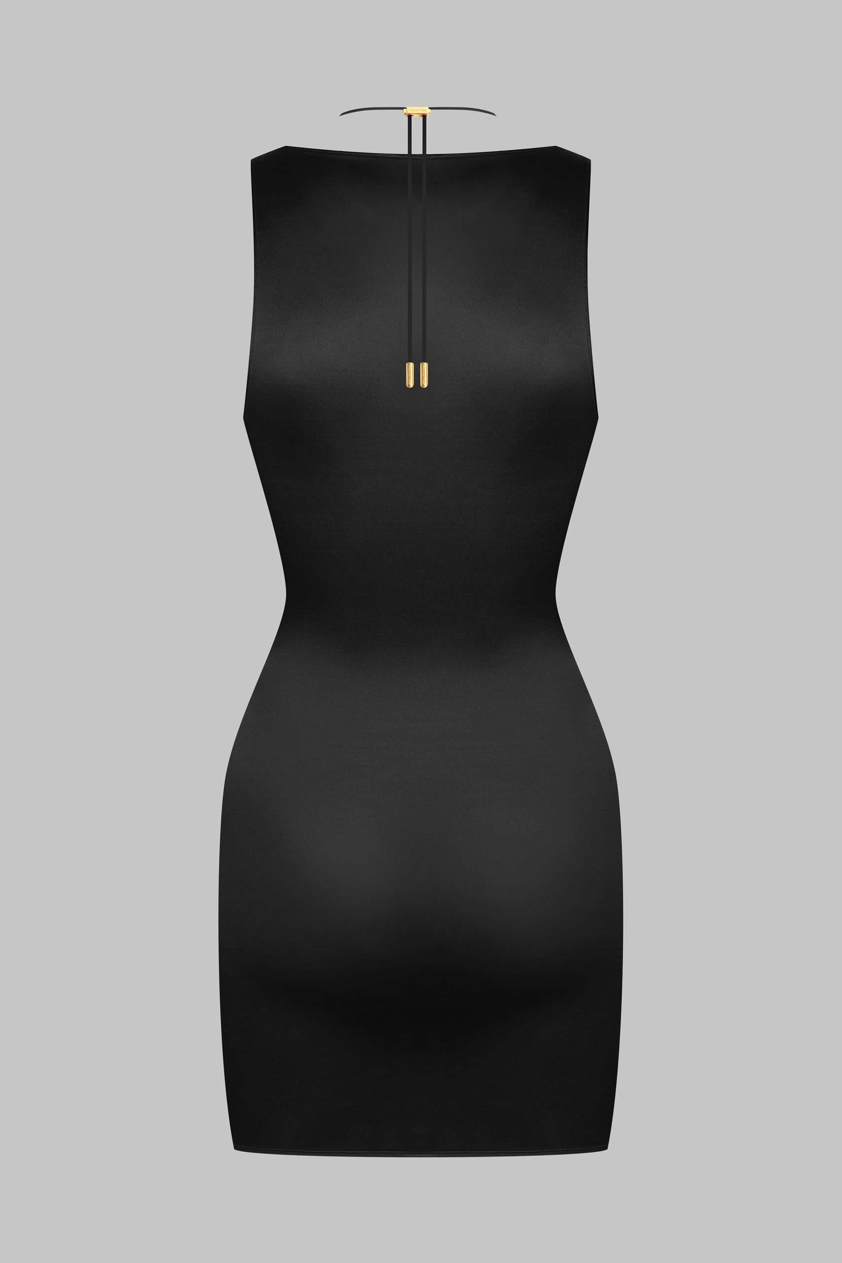 Plunging V-neck short dress, combining satin softness and elegant style. Repositionable and adjustable thanks to a unique adjuster and gold lipstick accessories by Maison Close, lacing around the neck enhances the décolleté while allowing you to personalise it as you wish.