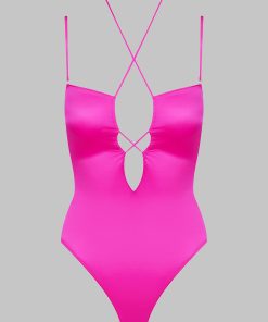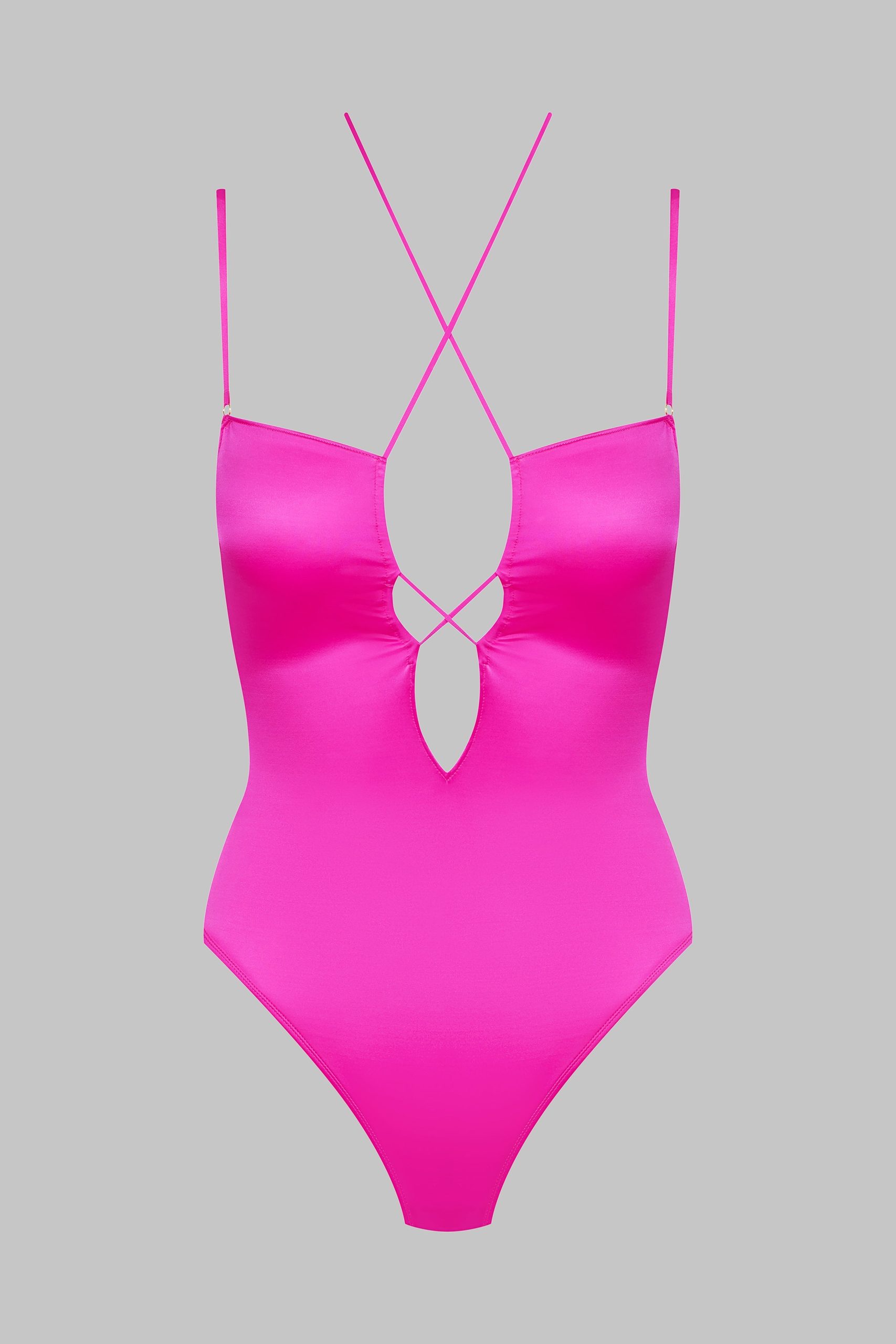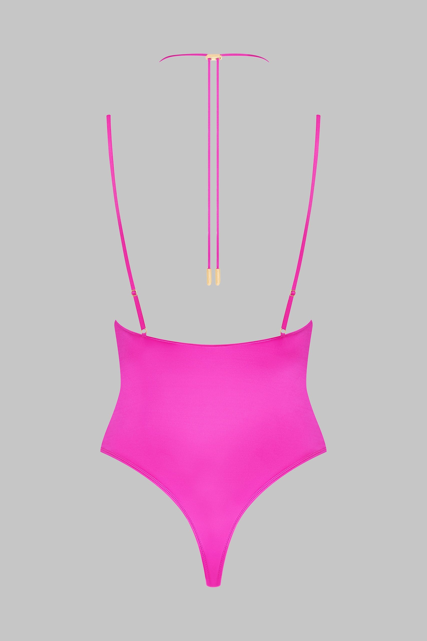 Thong body with straps, combining satin softness and elegant style. A ravishing back structured with flat and adjustable fine straps and an unmistakeable 80s-style neckline. Lacing detailing delicately pleated at the front offers adjustable, elegant openings thanks to a unique adjuster and gold lipstick accessories by Maison Close, to adjust as you wish. Adjustable hook-and-eye fastening at the crotch.