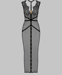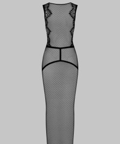 Long dress adorned with a gold cross to team Gothic lace with Swiss dot stretch mesh. Elasticated picot trim details structure the silhouette. Embellished with a removable and adjustable harness that attaches with a gold cross to different buttons. This body-con dress turns into a haunting ready-to-wear garment that can be worn day and night.