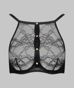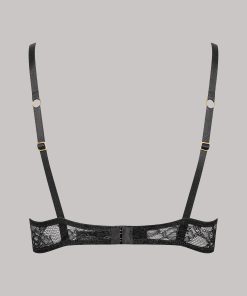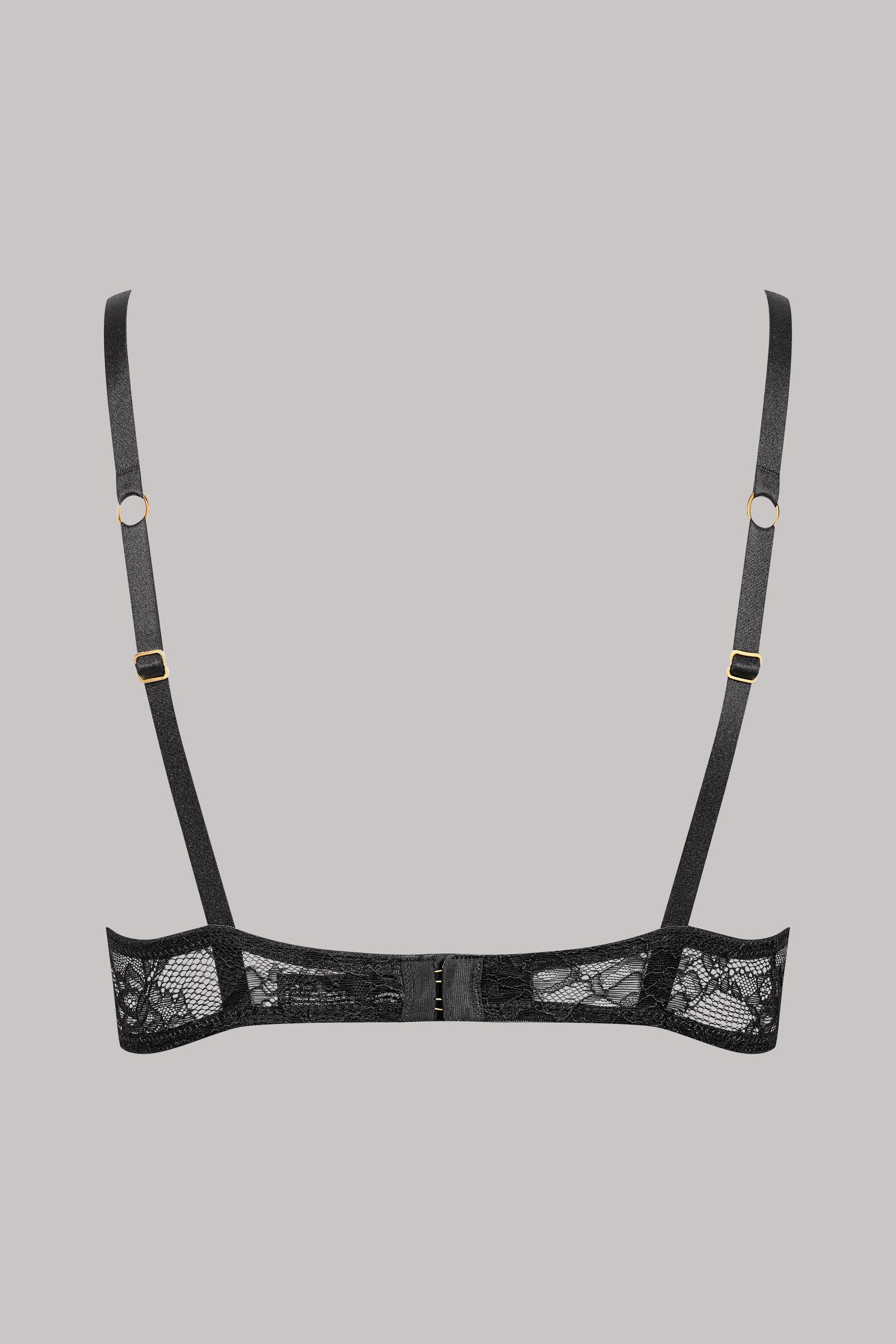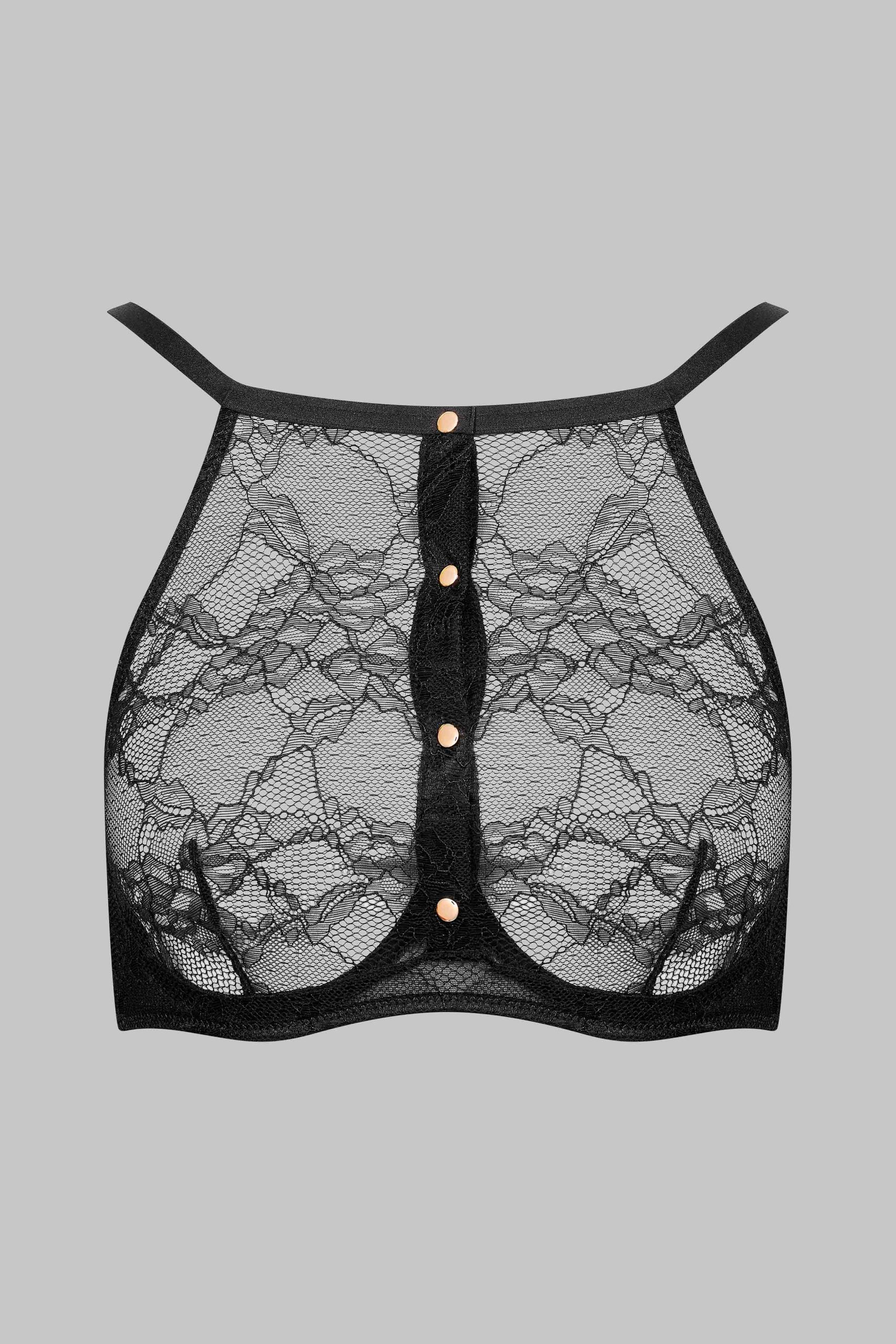 Underwired bra with full coverage of breasts. Bust fully covered with sheer stretch lace. Opens at the front with magnetic gold press-studs. Adjustable straps and adjustable hook-and-eye fastening on the back.