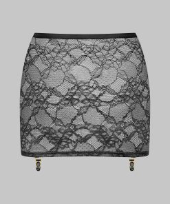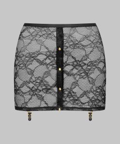 Sheer stretch lace mini skirt. Opens at the front with magnetic gold press-studs. Fastens at the waistband. Four removable garter belt attachments with gold accents.