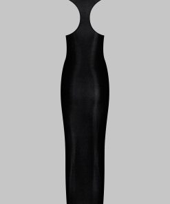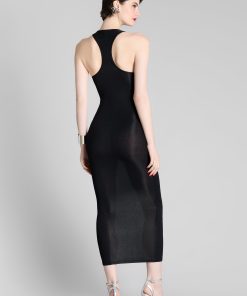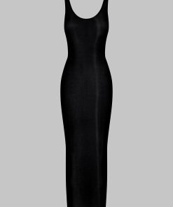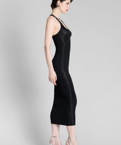 Long dress with a unique feel. Stretchy, ultra-soft, lightweight ribbed modal that stretches and has a sheer, shiny sheen. Figure-hugging, streamlined design with a scoop neckline and racer back.
