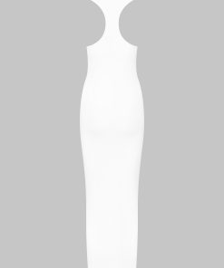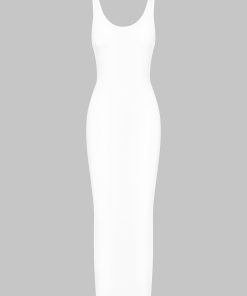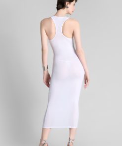 Long dress with a unique feel. Stretchy, ultra-soft, lightweight ribbed modal that stretches and has a sheer, shiny sheen. Figure-hugging, streamlined design with a scoop neckline and racer back.