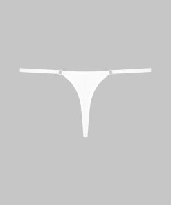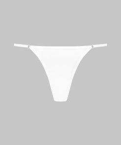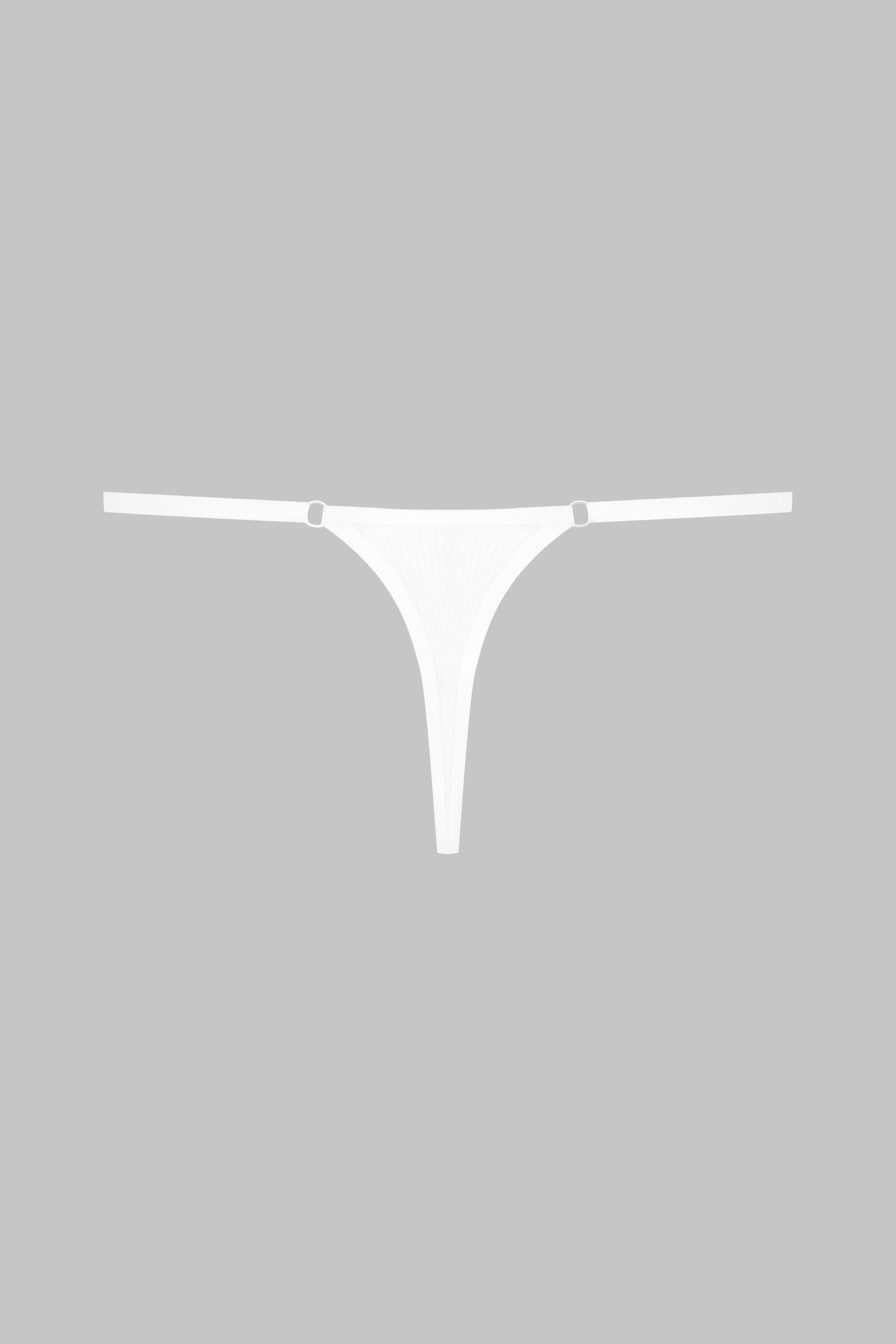 Minimalist mini thong with a unique feel. Stretchy, ultra-soft, lightweight ribbed modal that stretches and has a sheer, shiny sheen. Featuring 2 modal-covered non-removable elasticated straps with adjustable silver trim. Cotton-lined crotch.