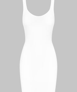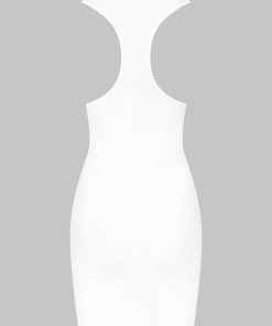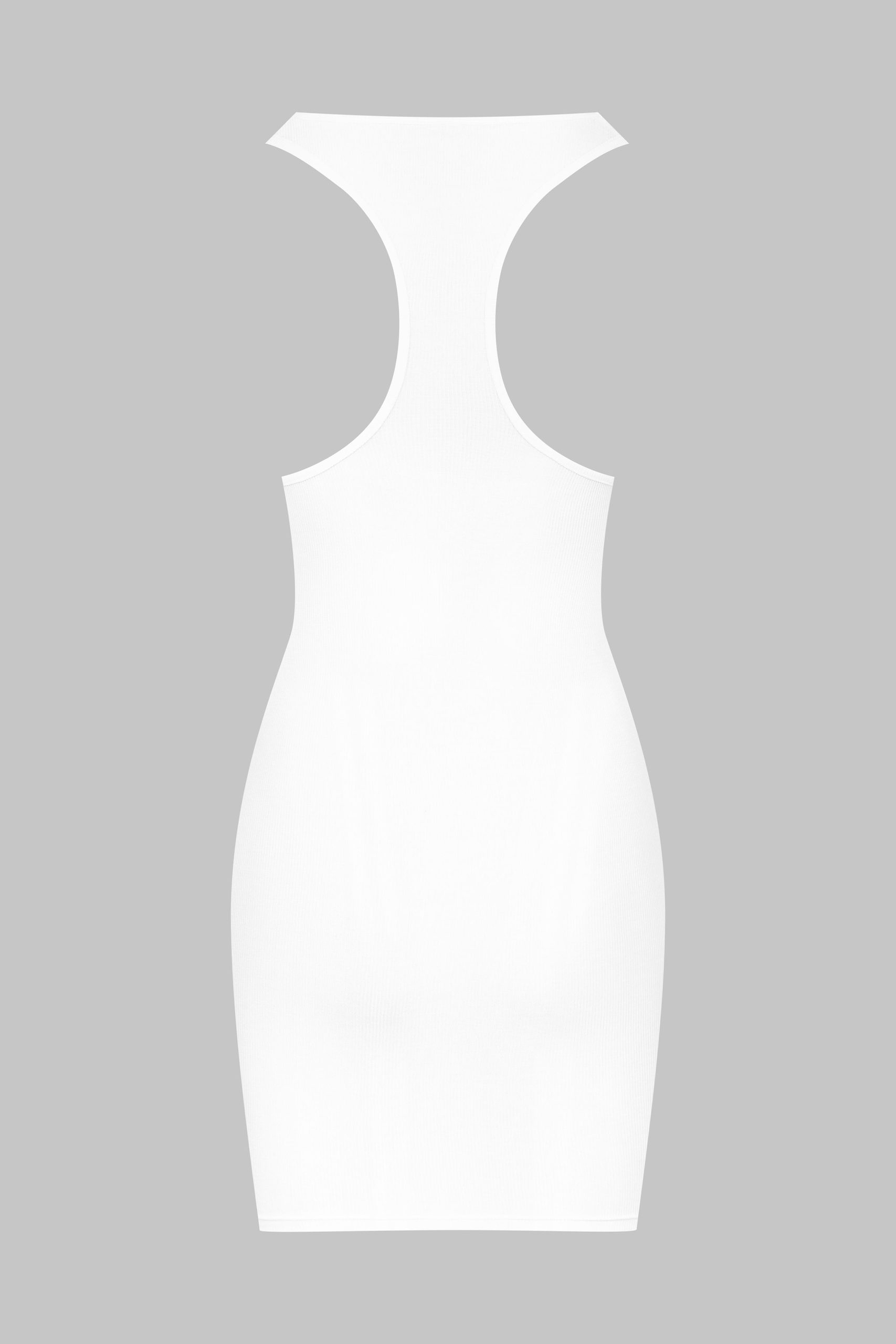 Short dress with a unique feel. Stretchy, ultra-soft, lightweight ribbed modal that stretches and has a sheer, shiny sheen. Figure-hugging, streamlined design with a scoop neckline and racer back.