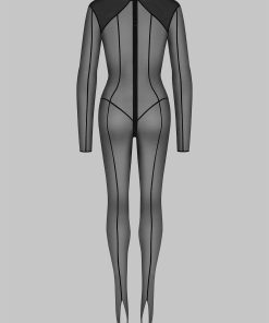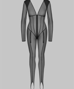 Catsuit in 100% sheer mesh. Multiple seams that structure the entire silhouette. Double seam stocking effect with stirrups. Removable outer garters for layering stockings and playing with transparency. Full zipped bodice that can be opened from either direction. Lined mesh at the shoulders.