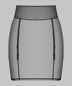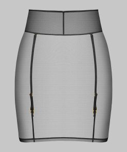 Short garter skirt in 100% sheer mesh. Lined belt for a snug fit. Cross seams coordinate with the removable garters. A slip skirt to wear over other pieces in the collection or under your clothing.