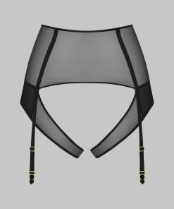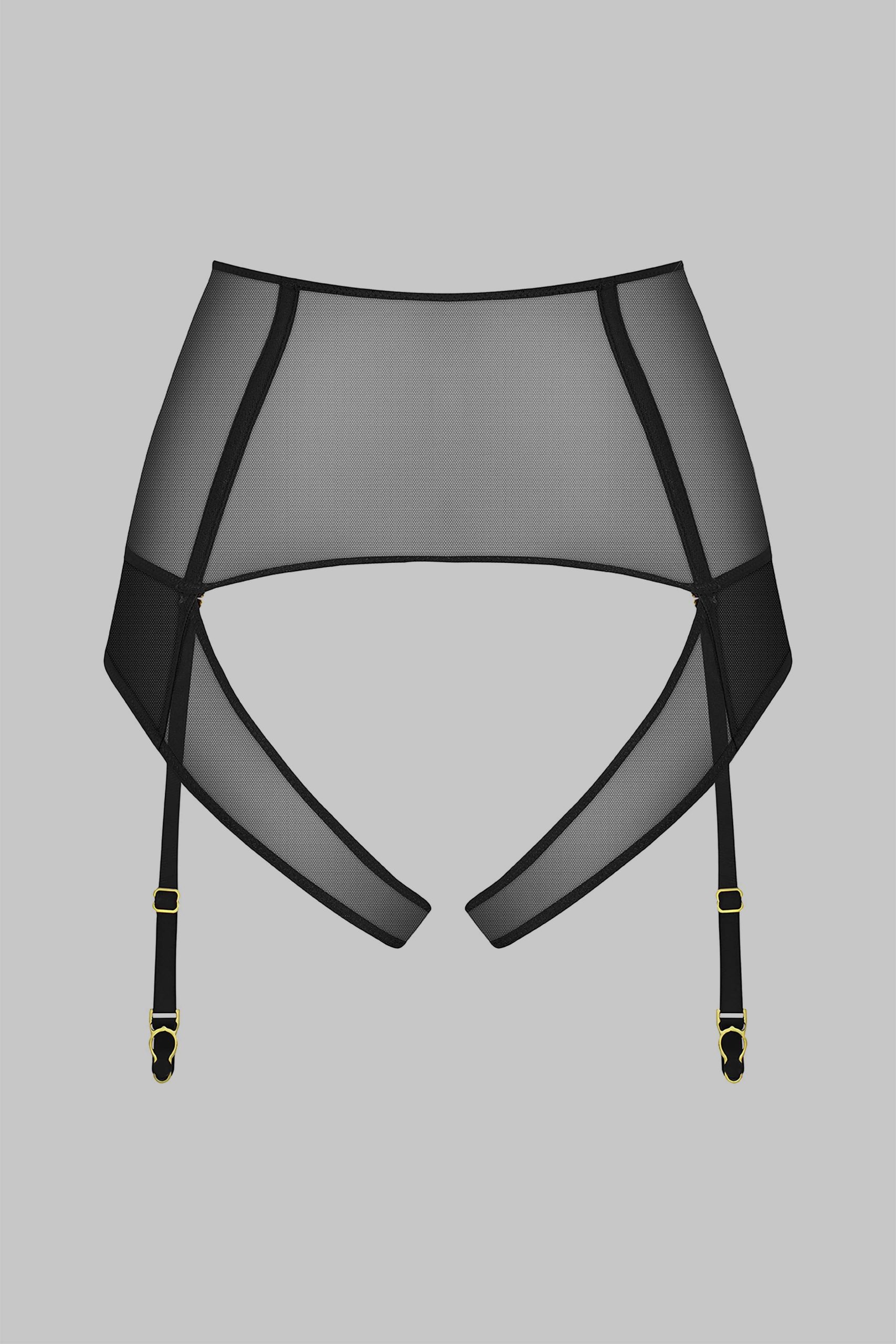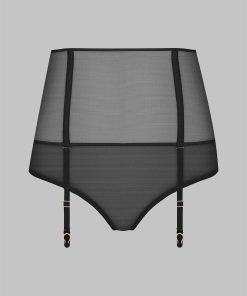 High-waist tanga in 100% sheer mesh. High-waisted belt structured by flexible boning. Two superimposed front panels open at the crotch to reveal beautiful heart-shaped buttocks. Removable and adjustable garters.