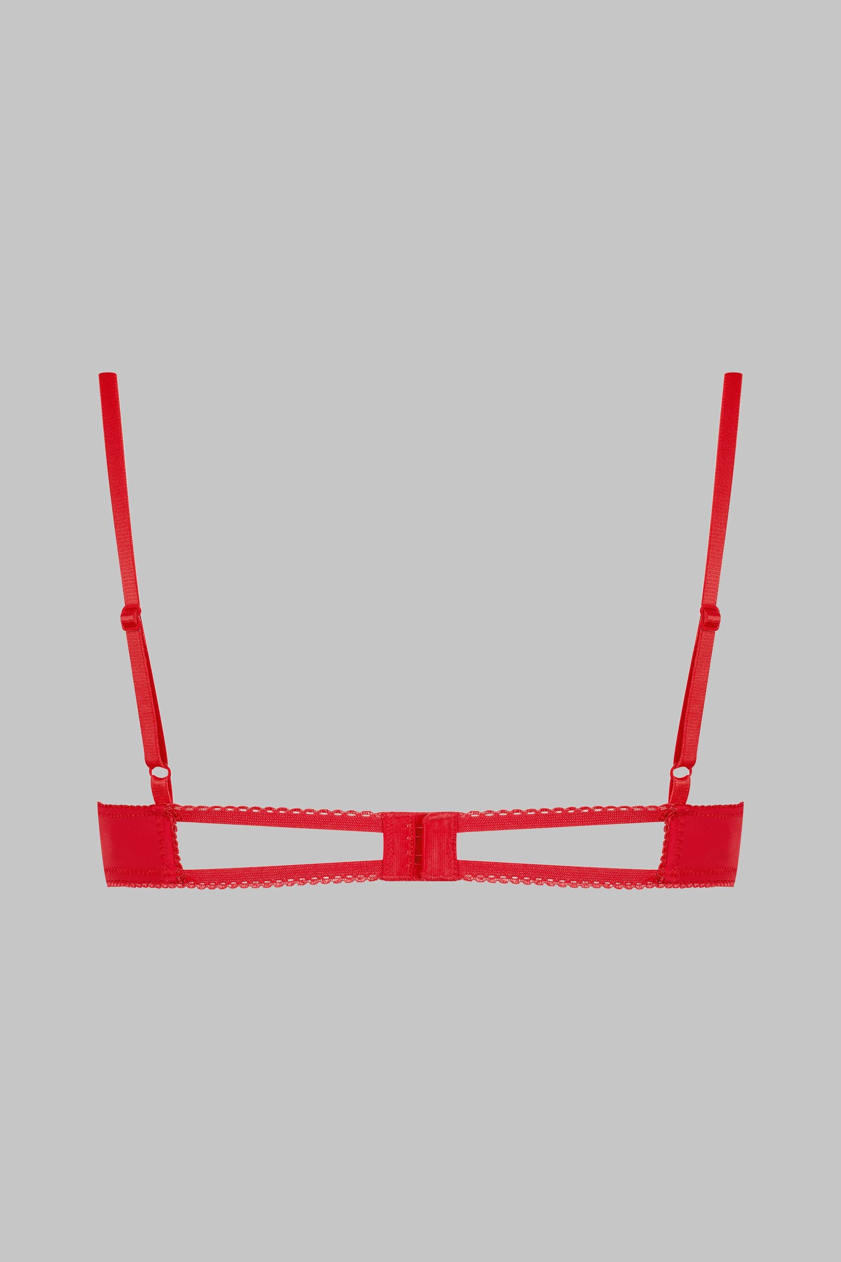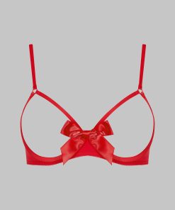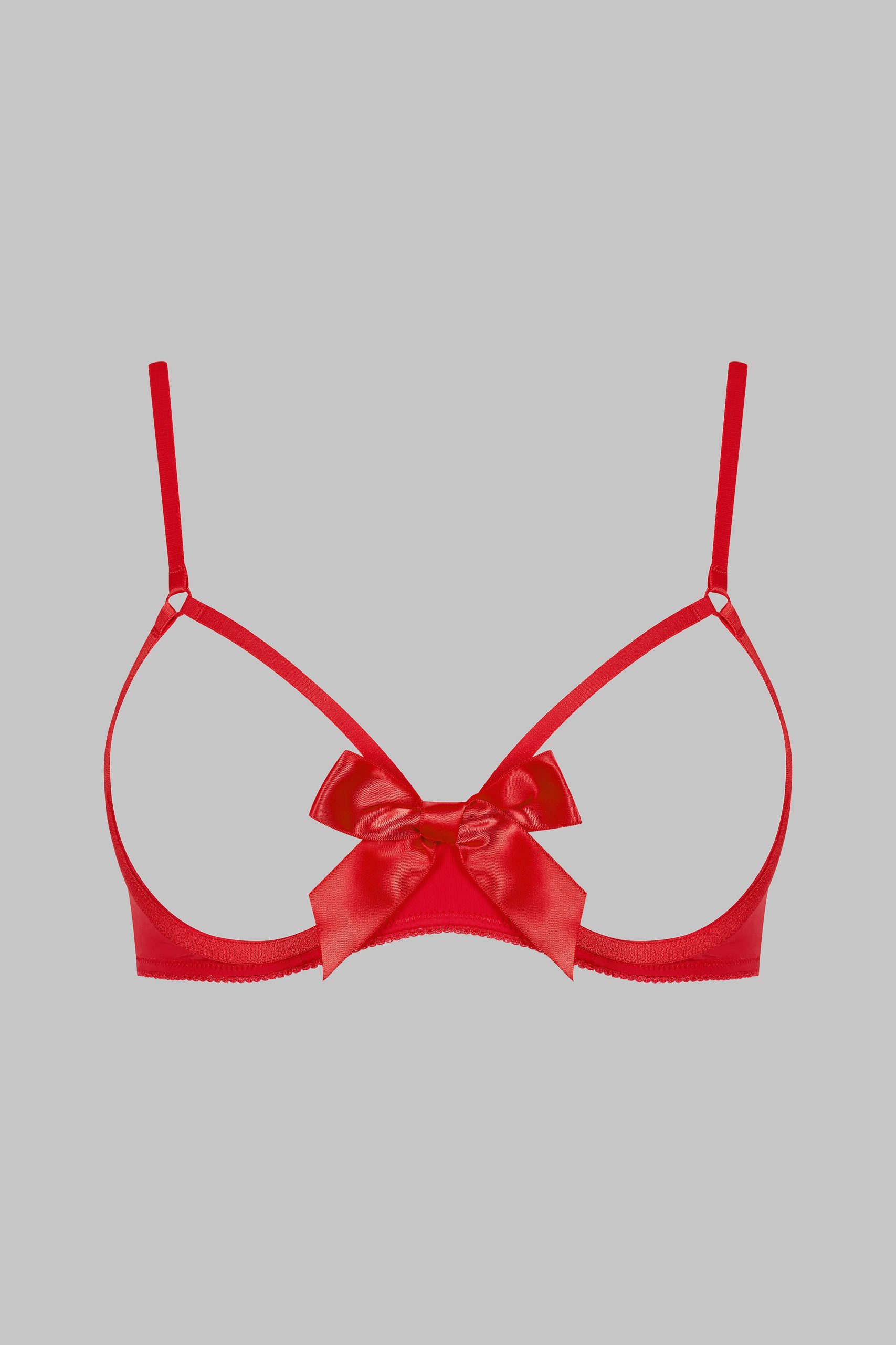 Peephole microfibre basque bra with elasticated picot trim. Cupless design with two pieces of elastic; this underwired style daringly reveals the bust. Clip the removable satin bow wherever you please like a little present. Elasticated straps can be adjusted with tone-on-tone accessories. Adjustable hook-and-eye fastening on the back.