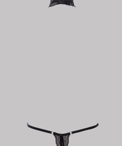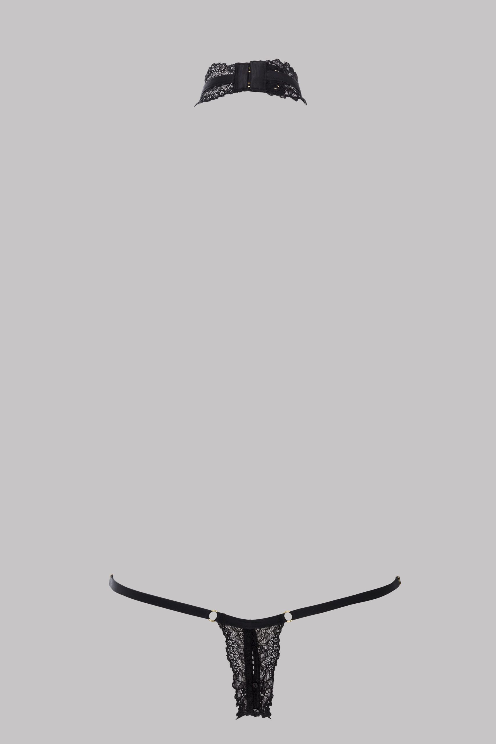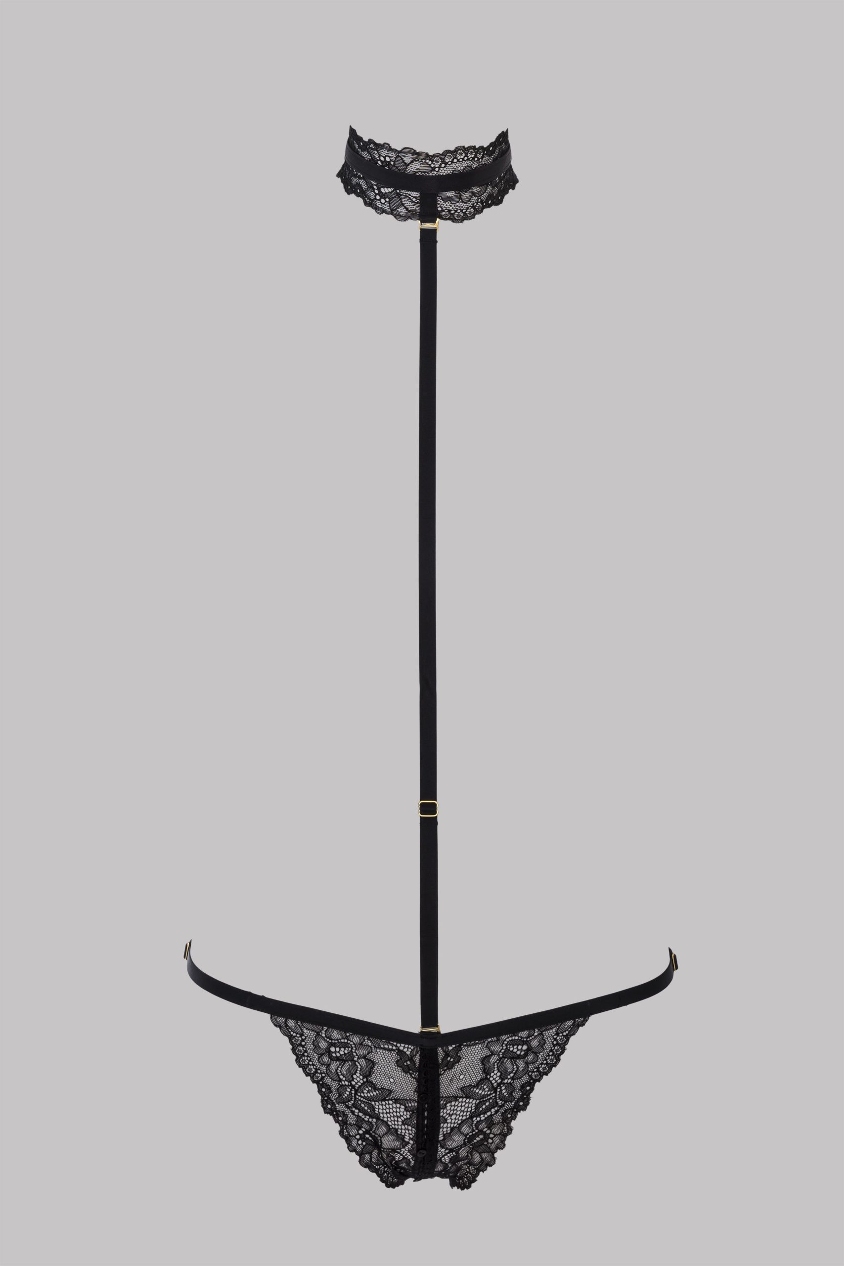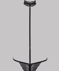 Harness thong with floral lace and stretchy, adjustable side elasticated bands. Opens at the crotch with tone-on-tone buttons. Fully adjustable and removable neck harness with hook-and-eye fastening on the neck.