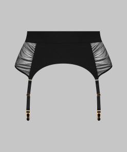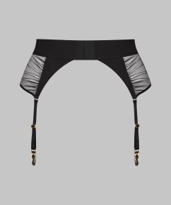 Bi-material garter belt with sides feature transparent tulle structured with pleated seams that define the hips. Adjustable elasticated waistband fastening in opaque material with a smooth, fine hook and eye fastening. The opaque front and back material offers discretion. Four adjustable, non-removable suspenders, with gold accessories, for stockings to complete the look.