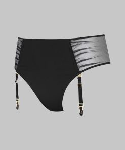 High-waisted, openable, bi-material tanga. A set of bevelled cuts that reveal delicate pleats on the sides provide a tiger effect, contrasted by the opaque fabric. Two superimposed panels of opaque material allow the crotch to be freed from the front or back. Four adjustable, removable suspenders, with gold accessories, for complete the look with stockings.