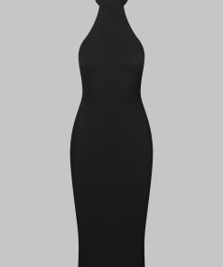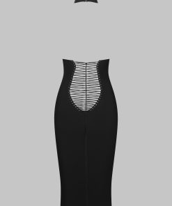 This halter midi dress offers a sleek, fitted silhouette. The open back is adorned with adjustable lacing featuring a regulator for precise adjustment. The halter neckline is equipped with a black metal hook and three adjustment settings. Its midi length makes it an ultra-elegant piece.