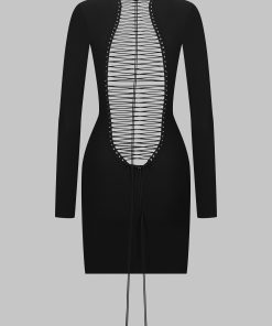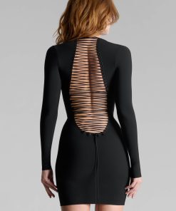 Designed to highlight the back and the silhouette, this short dress combines precise double lacing and a fitted cut. The back lacing is divided into two parts: one ascends to adjust the neckline, while the other descends into the curve of the lower back, allowing for optimal customization. Bust darts and the adjustable cord length ensure a perfect fit.