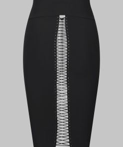 The pencil skirt from the Nuit Infinie collection captivates with its highly fitted cut and high-waisted design. The back lacing, adjustable with a stopper, ensures precise support while adding a distinctive graphic touch. The midi length offers an elegant and timeless allure, perfect for both day and evening wear.
