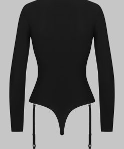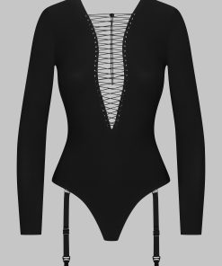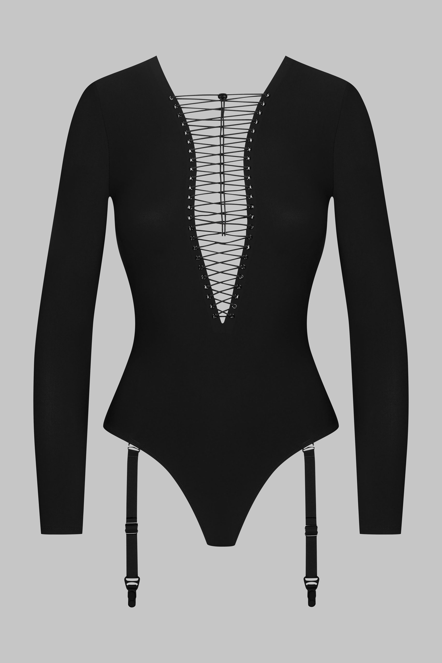 This thong bodysuit with detachable and adjustable suspenders offers a bold and elegant look. The V-shaped lacing at the neckline provides a precise fit and a graphic touch, while the black metallic finishes enhance its sophisticated style.