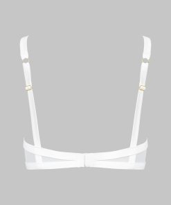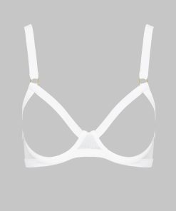 Underwired peekaboo bra with wide straps covered with semi opaque microfibre. Tulle insert at back. This piece has no cups and boldly reveals your breasts. Adjustable straps with gold hardware ensure a snug fit. Closes at the back with a comfortable hook and eye fastening.