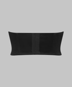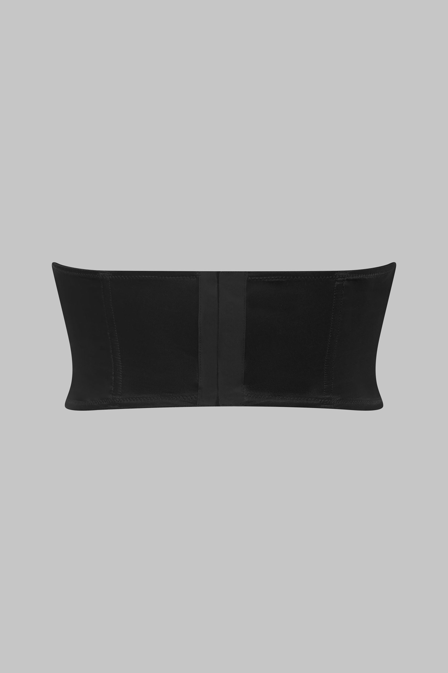 Bustier shape with flexible vertical boning in the front and back. Fastens at the back with a adjustable clip.